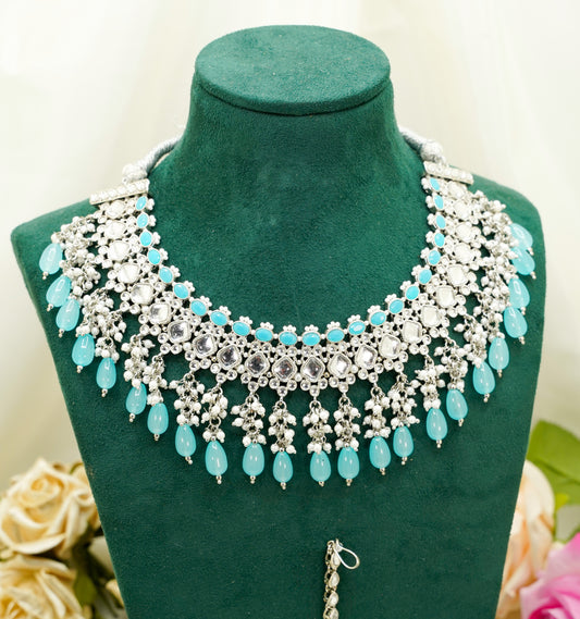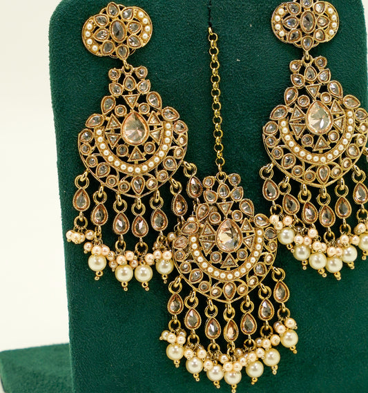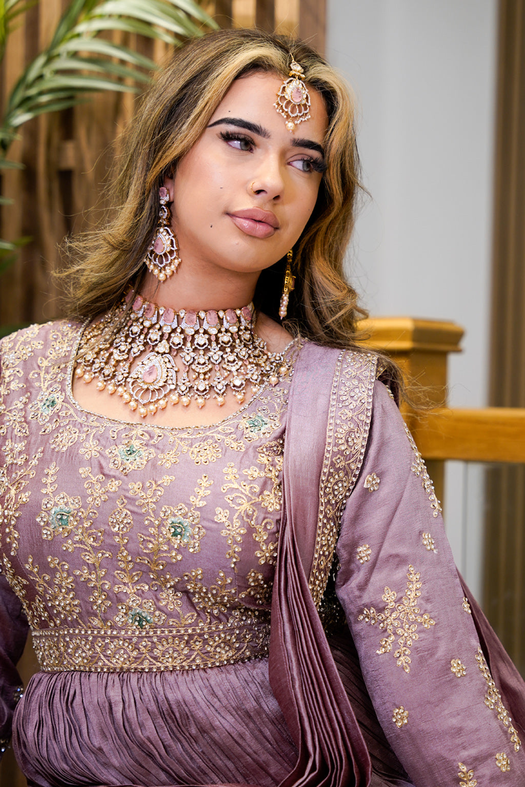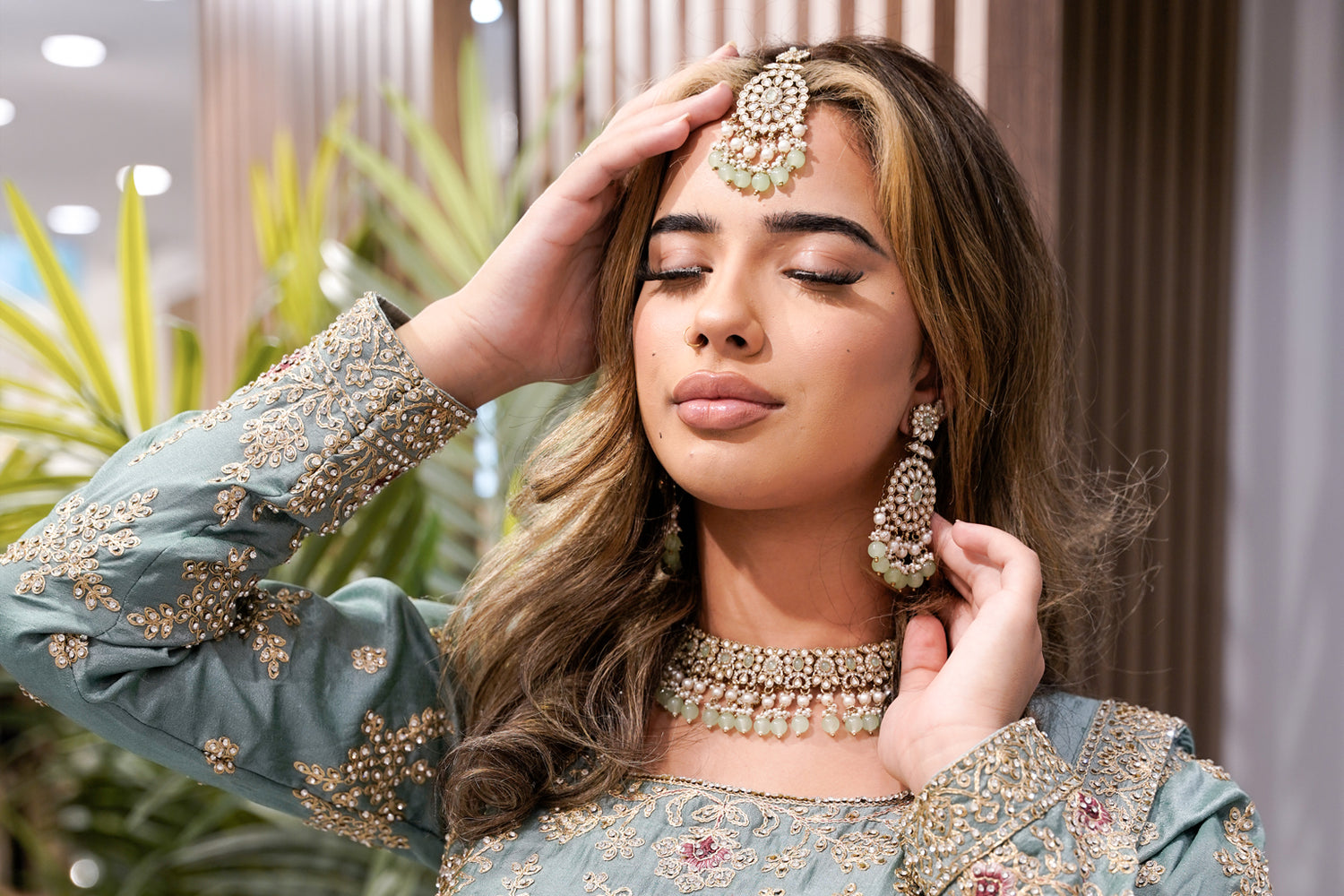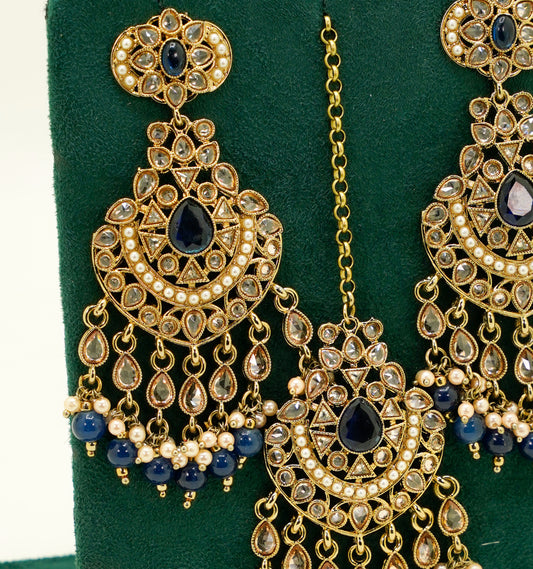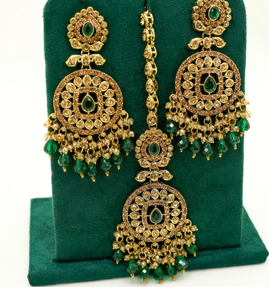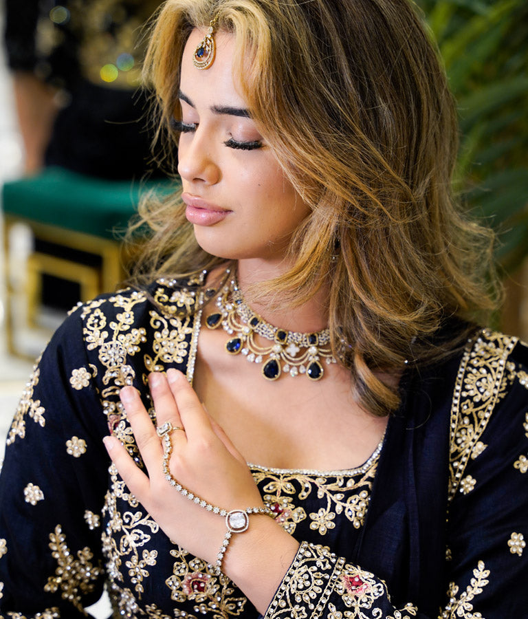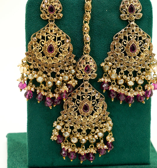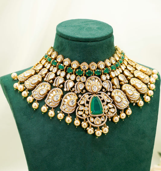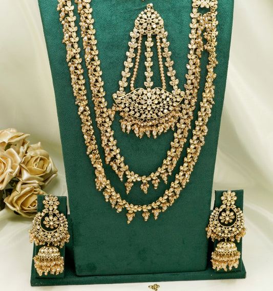 Make a bold and regal statement on your wedding day with this luxurious 12-piece gold and maroon bridal jewellery set. Designed for the bride who blends tradition with elegance, this...