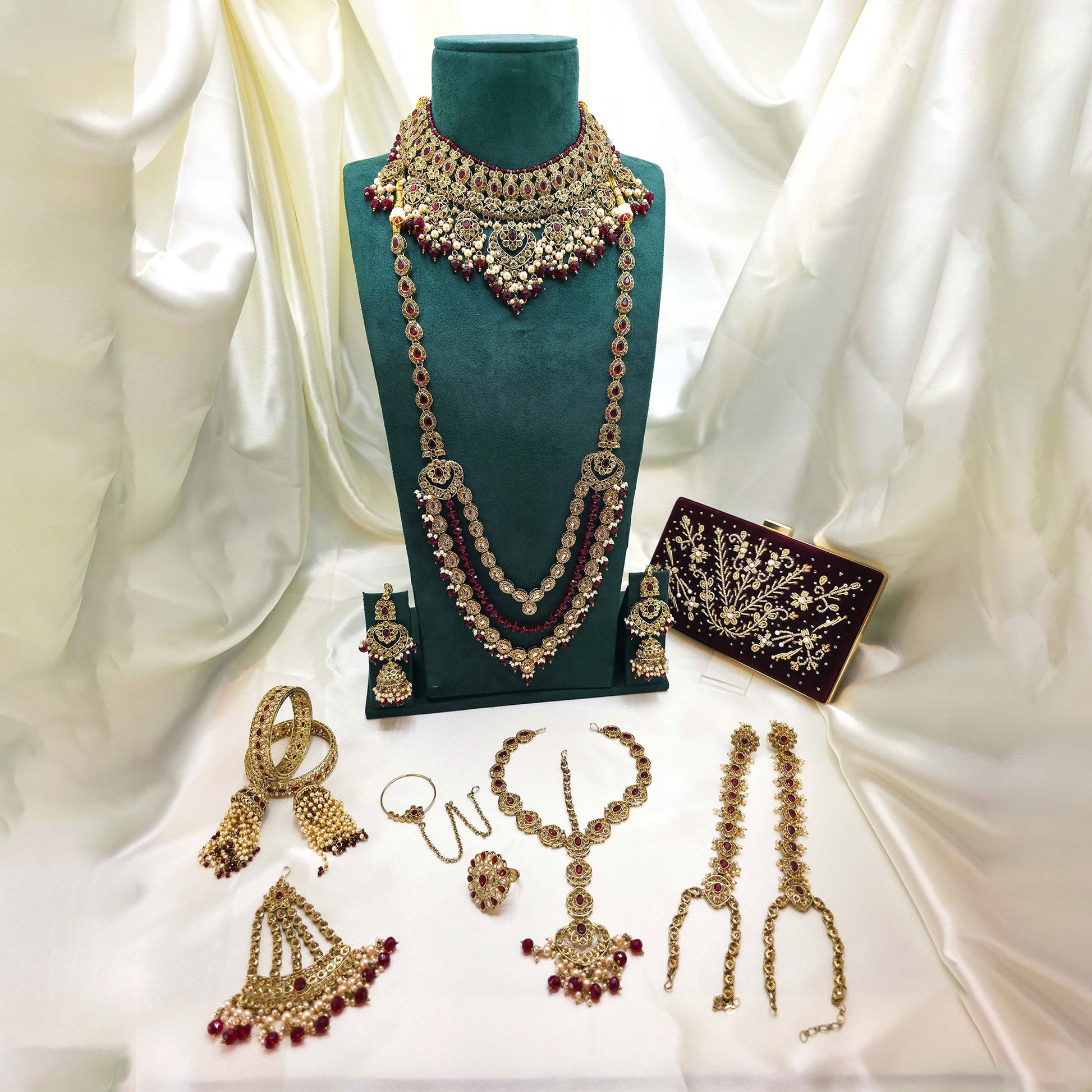 12-Piece Gold and Maroon Bridal Jewellery Set with Collar Necklace, Raani Haar & Embroidered Clutch