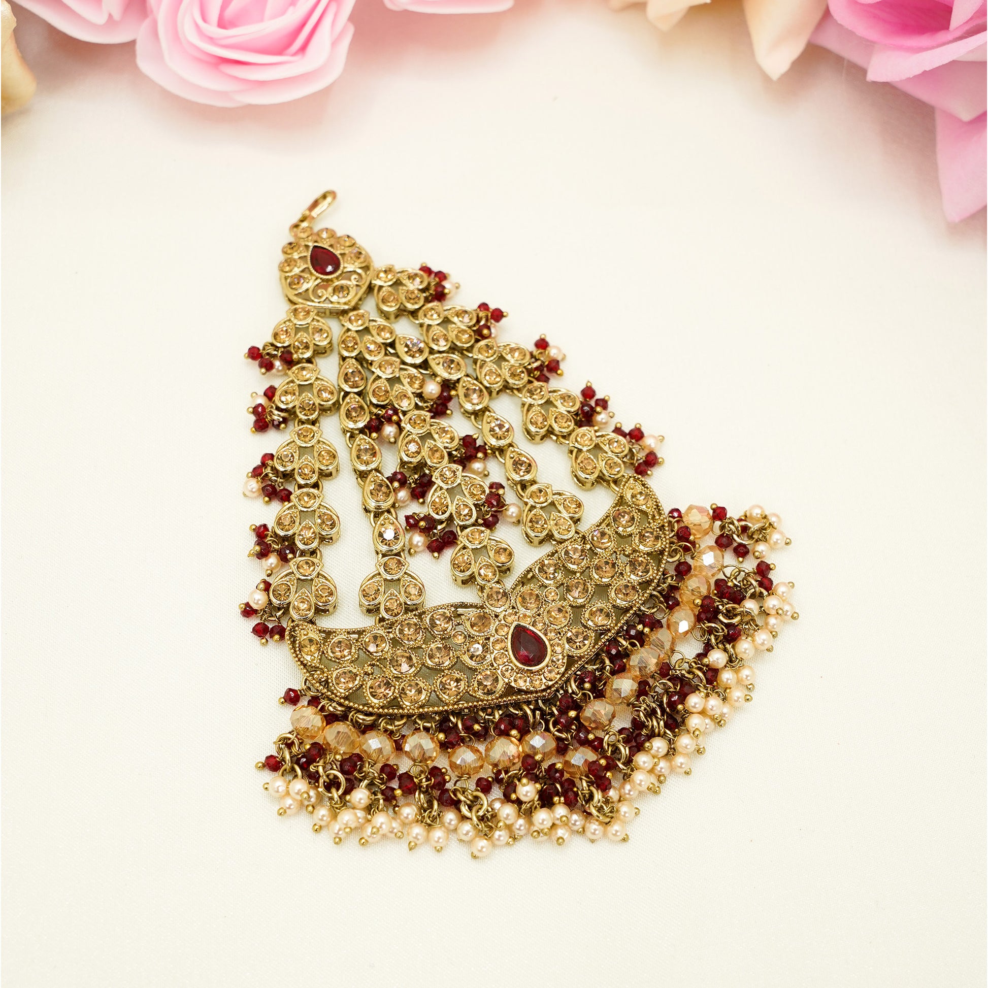 Turn tradition into a statement with this bold bridal chand tikka, featuring an antique gold base, deep maroon teardrop stones, and cascading champagne and pearl bead hangings. Designed with multiple layered strands and a grand crescent silhouette, this headpiece brings a regal presence to your bridal or festive outfit.