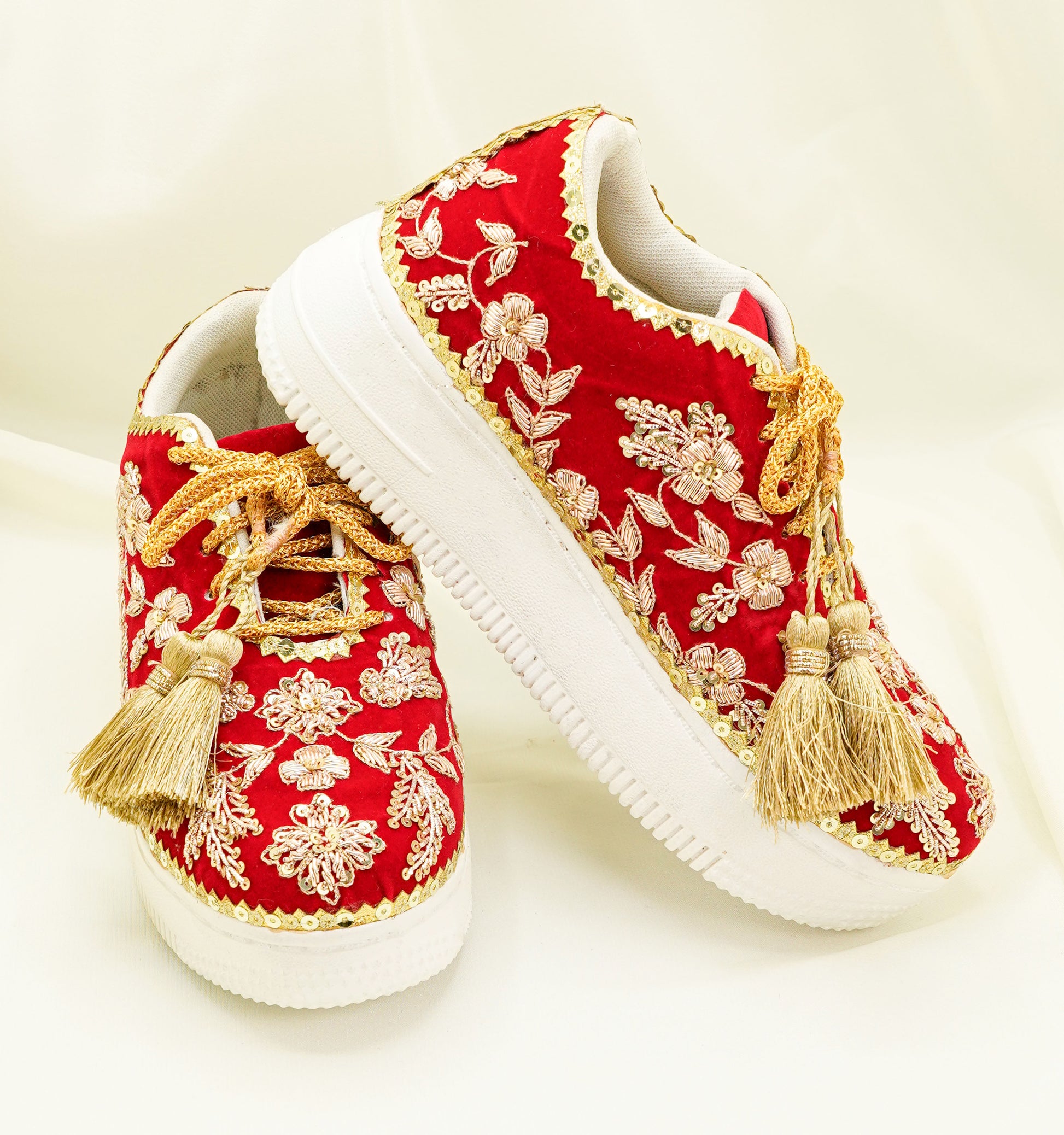 These shoes are a unique and beautiful pair of bridal sneakers, combining traditional embroidery with modern sneaker style.. They’re great for events like mehndi, sangeet, or even the wedding ceremony, especially for brides who prefer flats over heels.