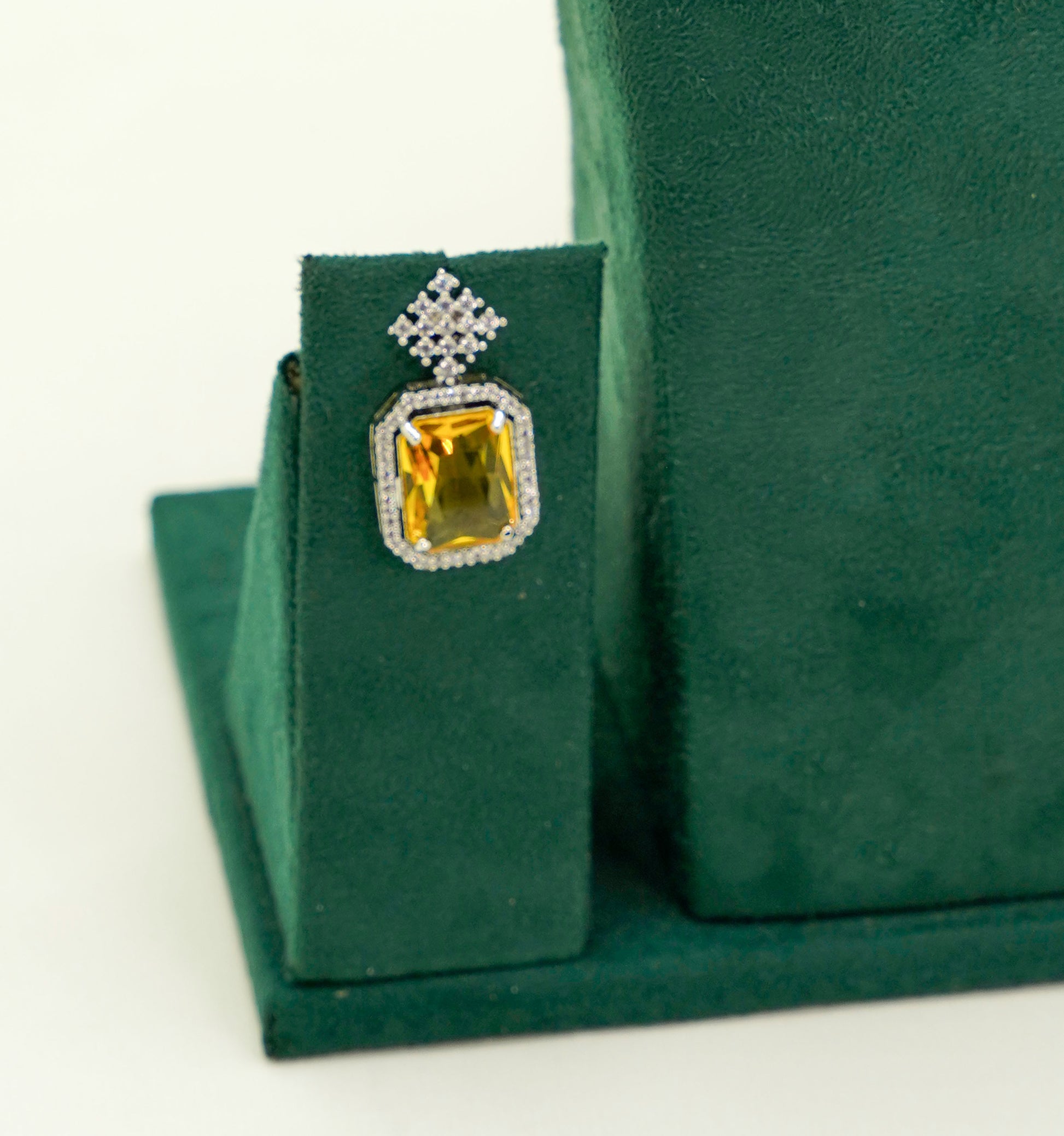 Centerpiece Gemstone: Features radiant emerald-cut golden citrine stones, known for their warm, sunlit glow.