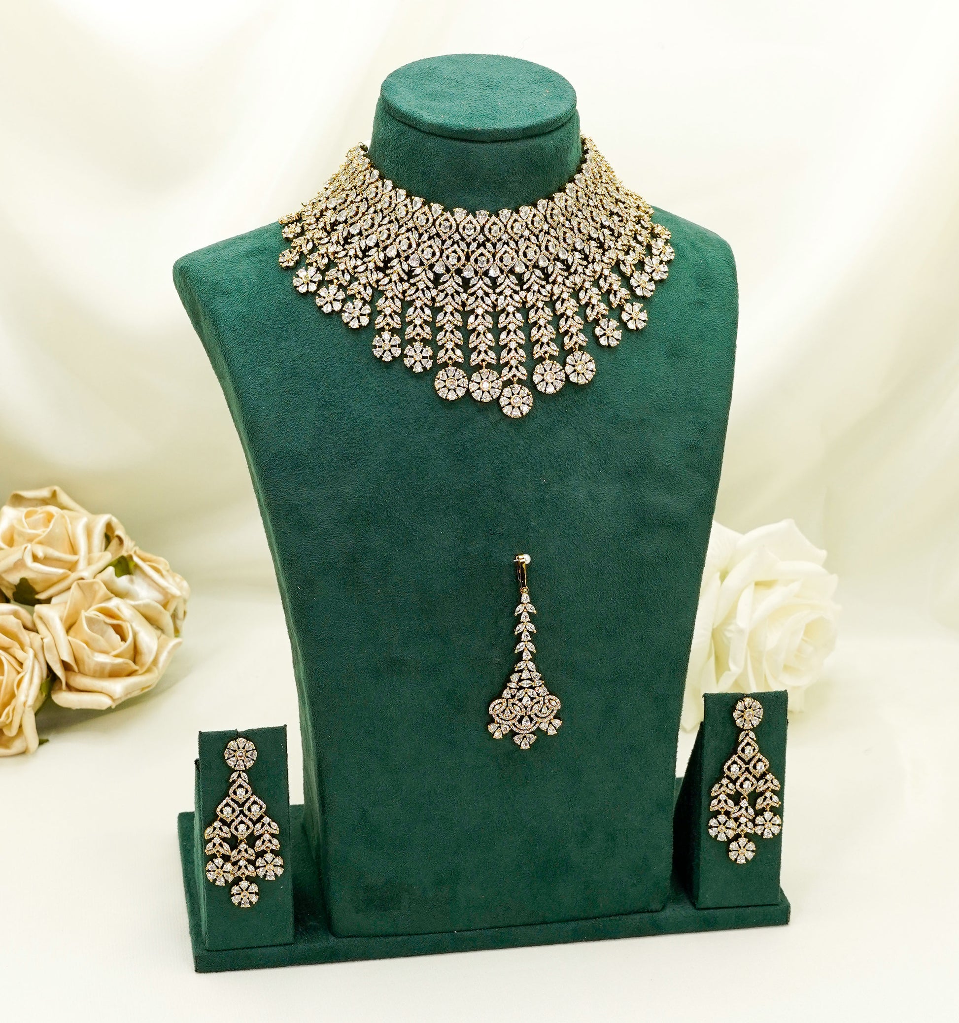 This beautiful jewellery set includes a wide choker-style necklace, a pair of matching earrings, and a stylish maang tikka. It is decorated with shiny white stones and gold accents in a detailed, elegant design. Perfect for weddings, parties, and traditional events.