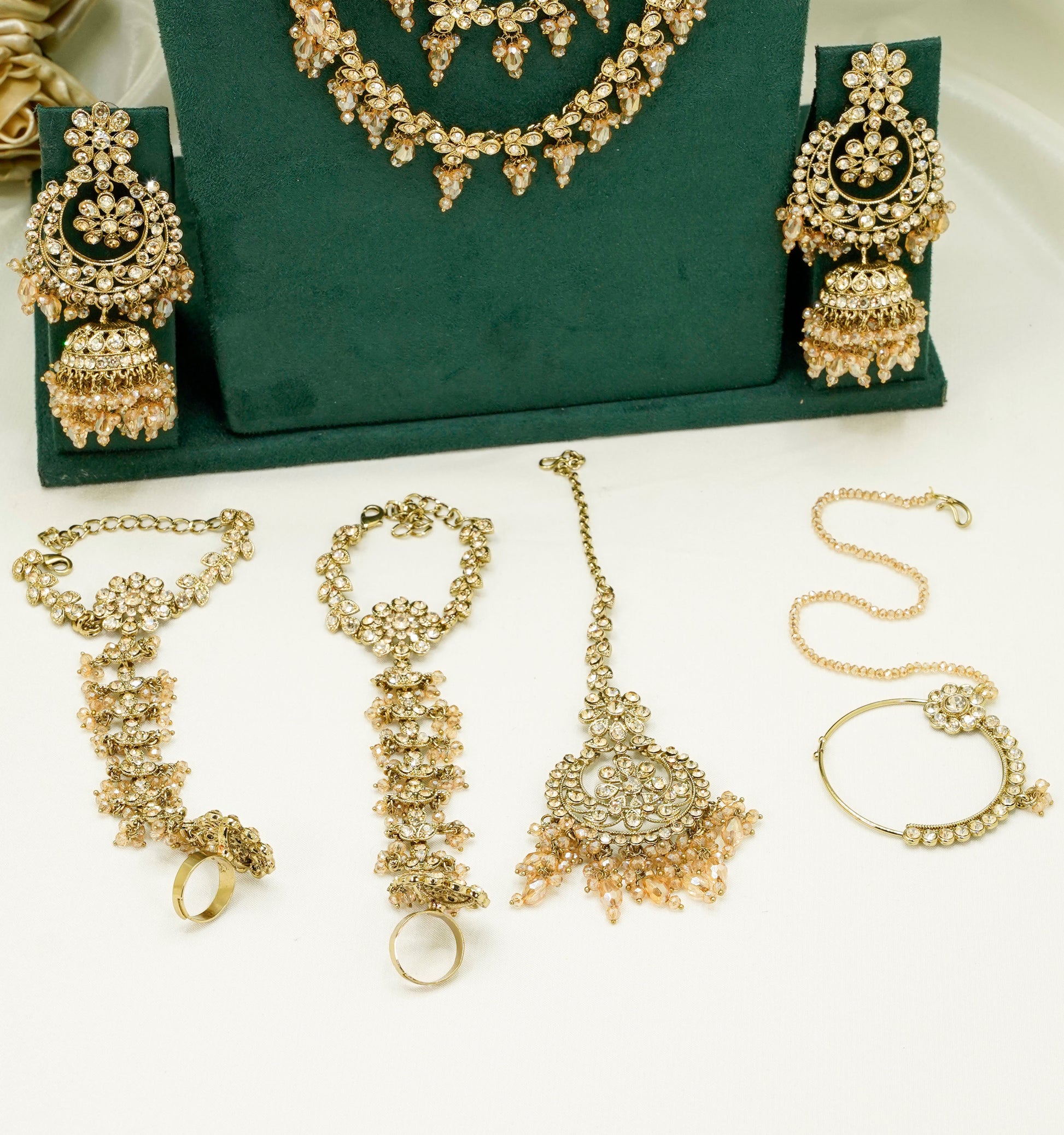 7pc Set Includes: Necklace, Long Mala Necklace, Side Piece, Earrings, Headpiece With Tikka, Haathphool, Nose Ring.
