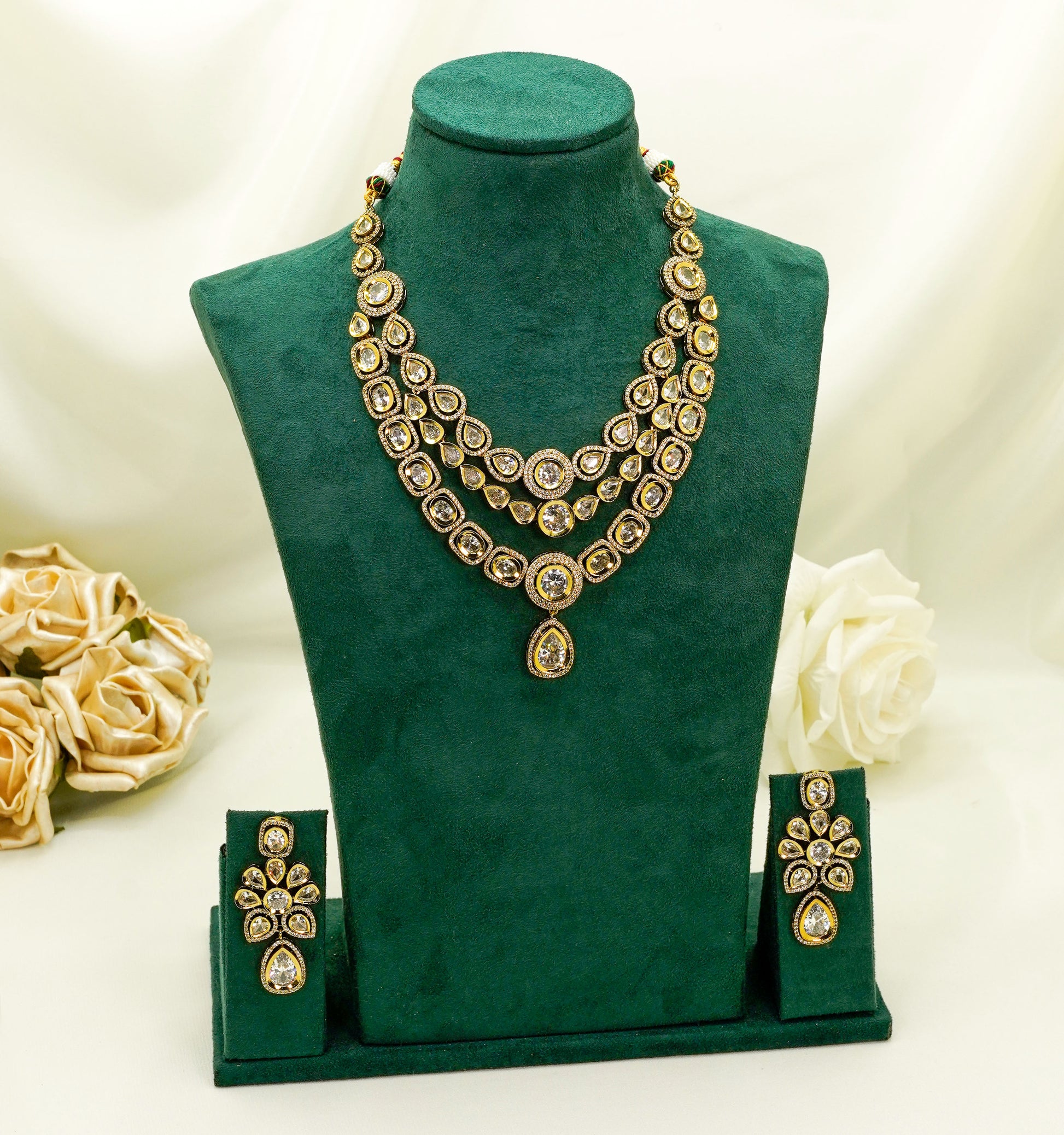 The jewellery set comprises a luxurious multi-layered necklace and a pair of matching earrings, all crafted with intricate design and sparkling gemstones. The necklace features three layers, each adorned with round and teardrop-shaped stones encased in a gold-tone setting, creating a regal and opulent appearance. The central pendant of the necklace is a prominent teardrop-shaped gemstone surrounded by smaller stones, adding to its elegance.
