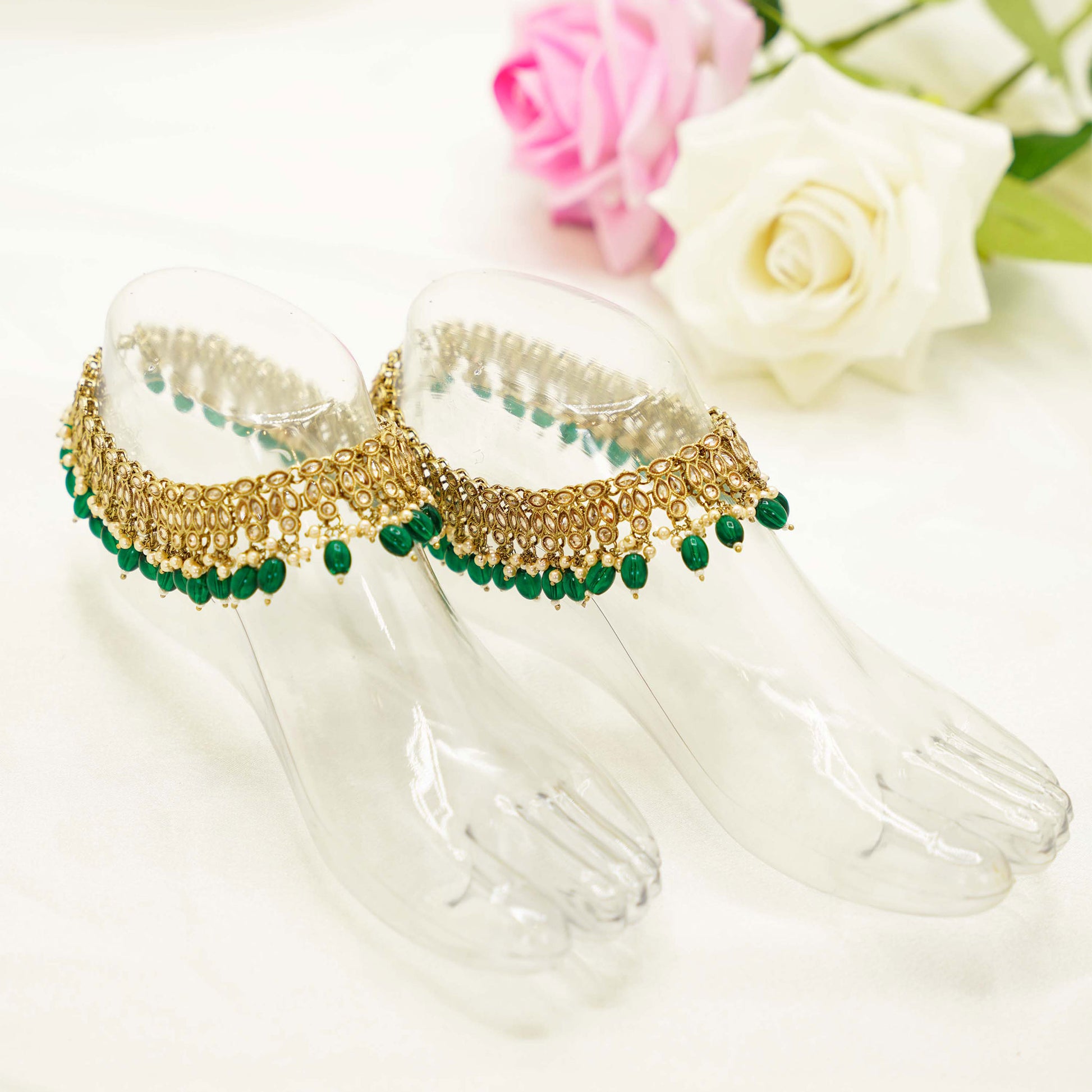 Grace every step with this elegant gold payal, adorned with dainty green beads and traditional kundan-style detailing. Crafted to enhance your festive looks, these ankle bracelets offer the perfect blend of cultural richness and graceful charm.