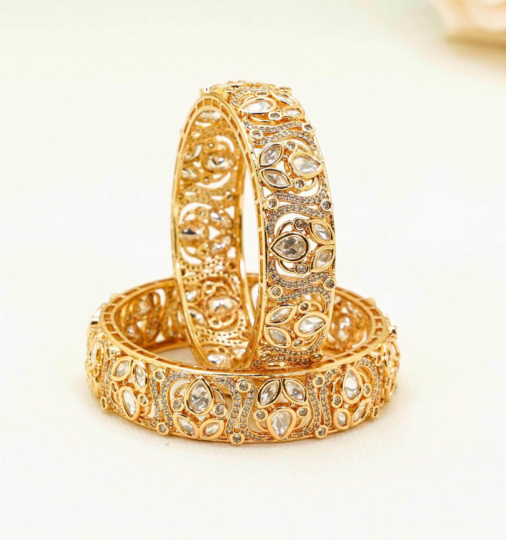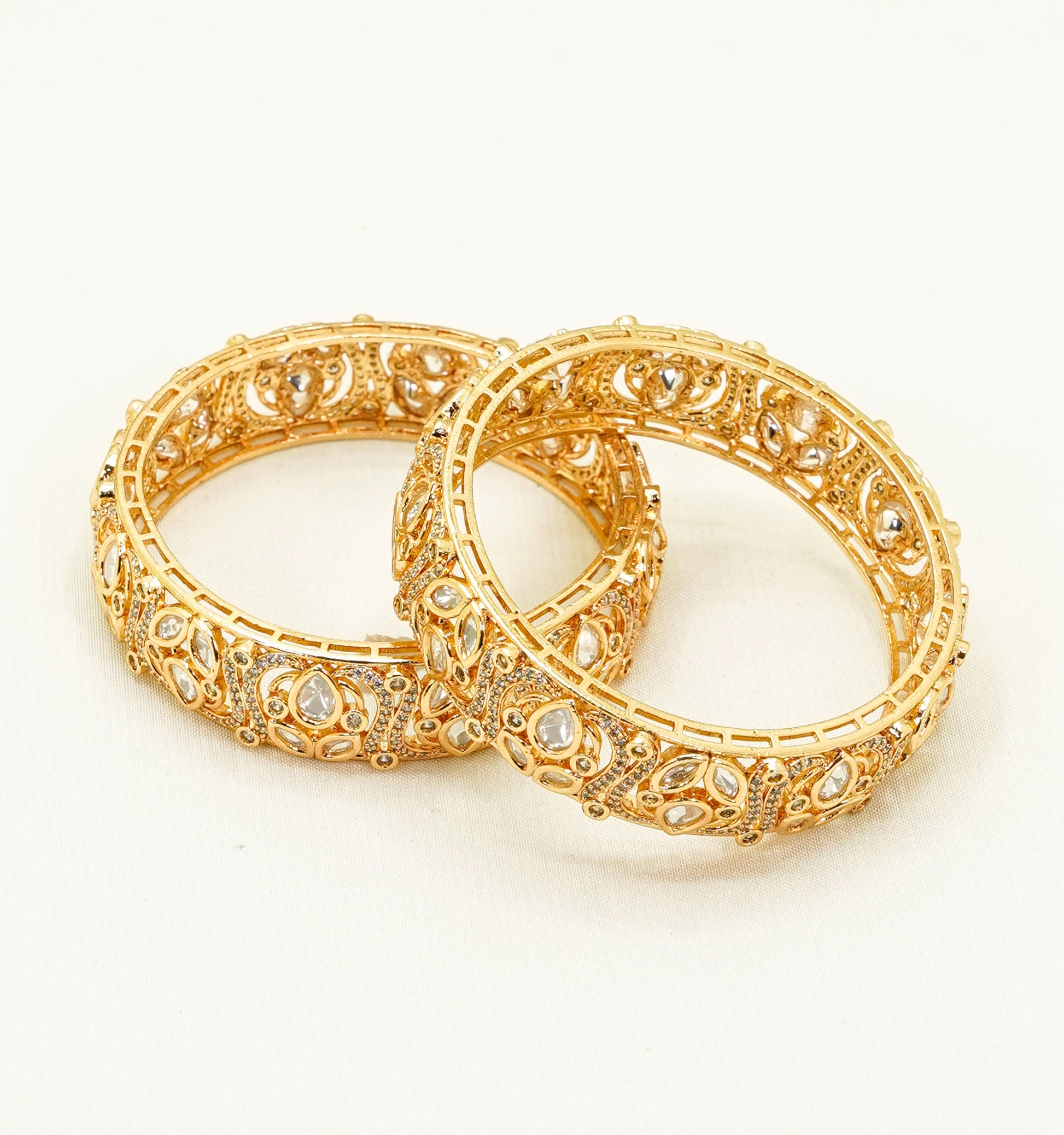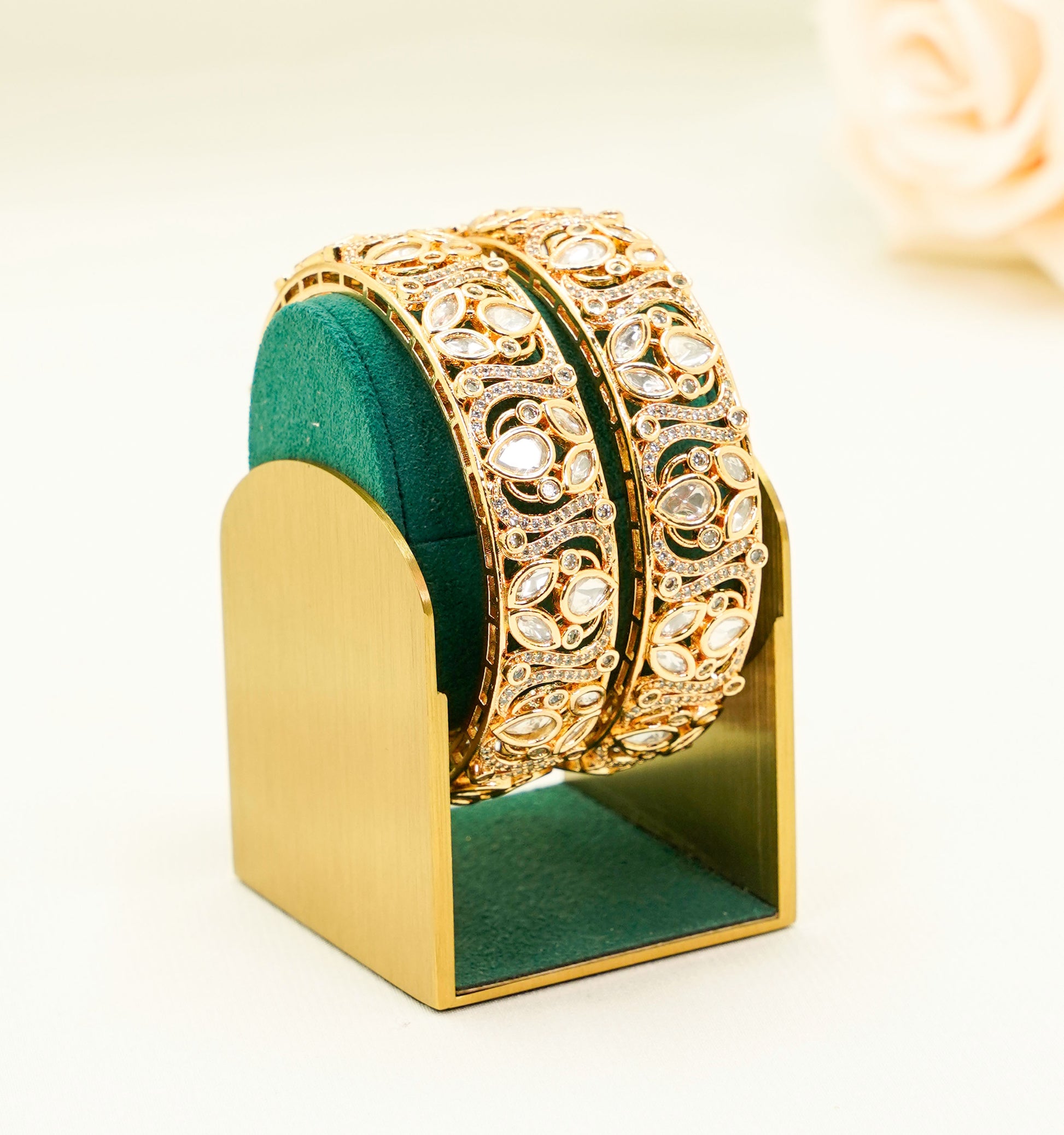 These statement-making bangles are designed for the spotlight. Crafted in gold-plated finish with intricate cutwork and clustered Kundan detailing, they bring a royal vibe to any traditional or festive outfit. The grand design is perfect for weddings, bridal wear, or special occasions where you want to stand out.