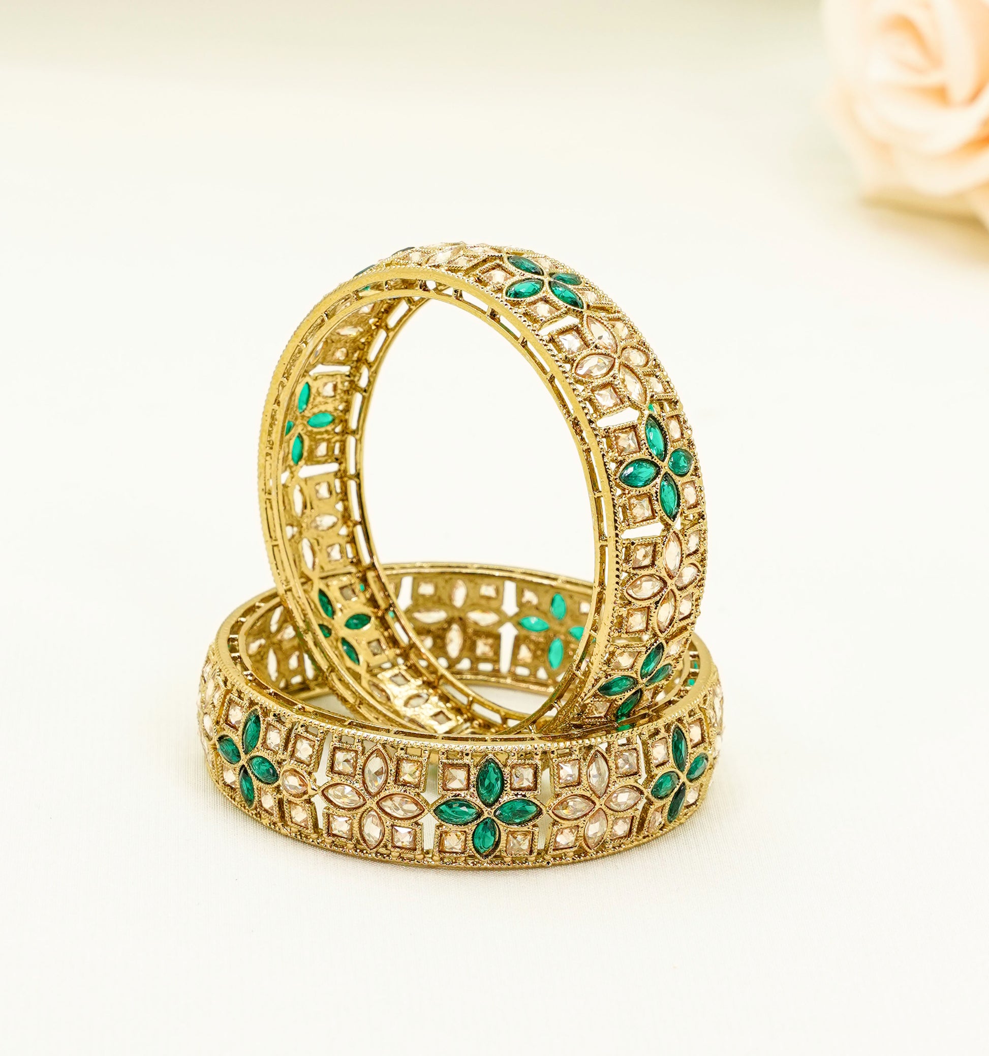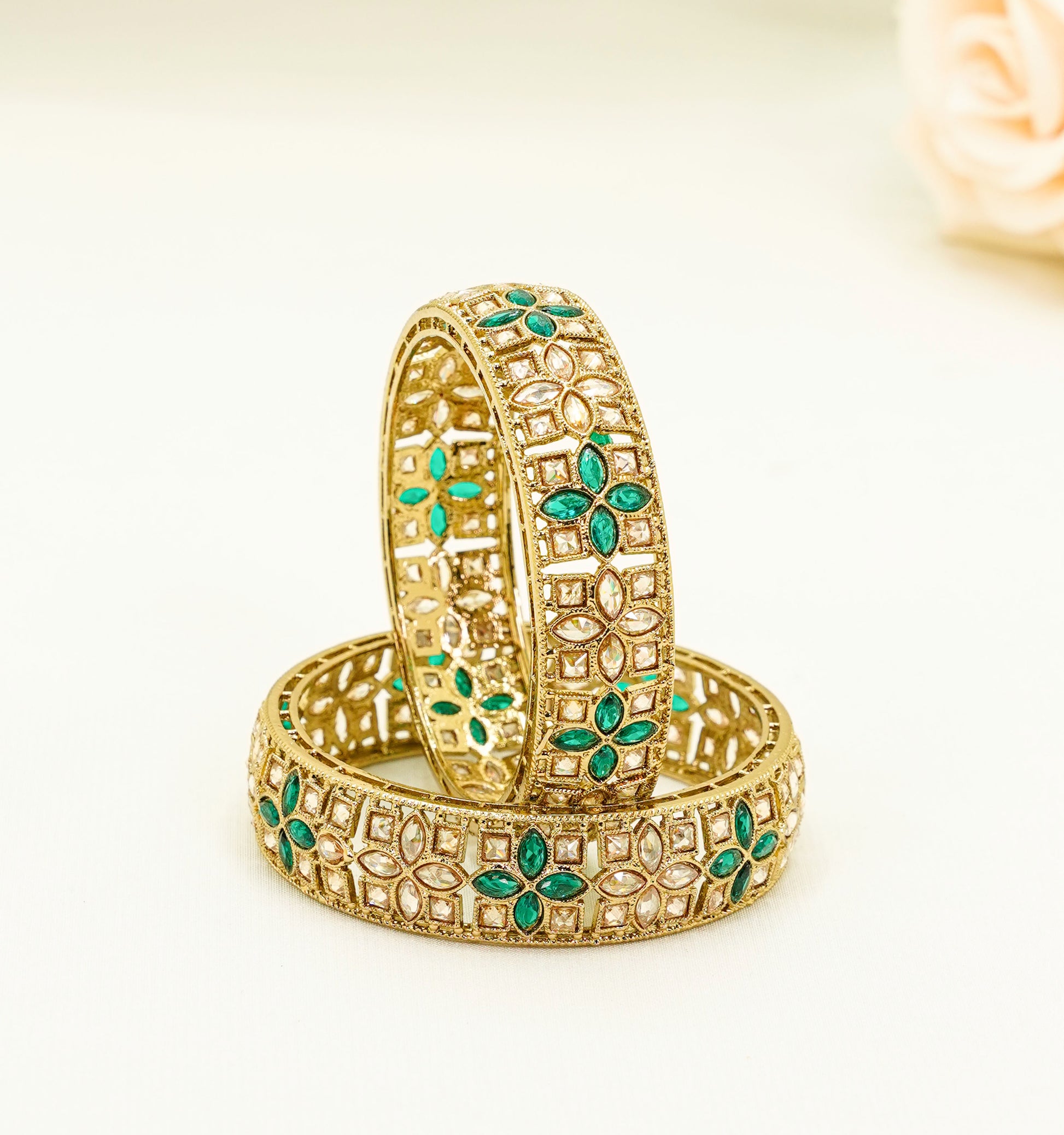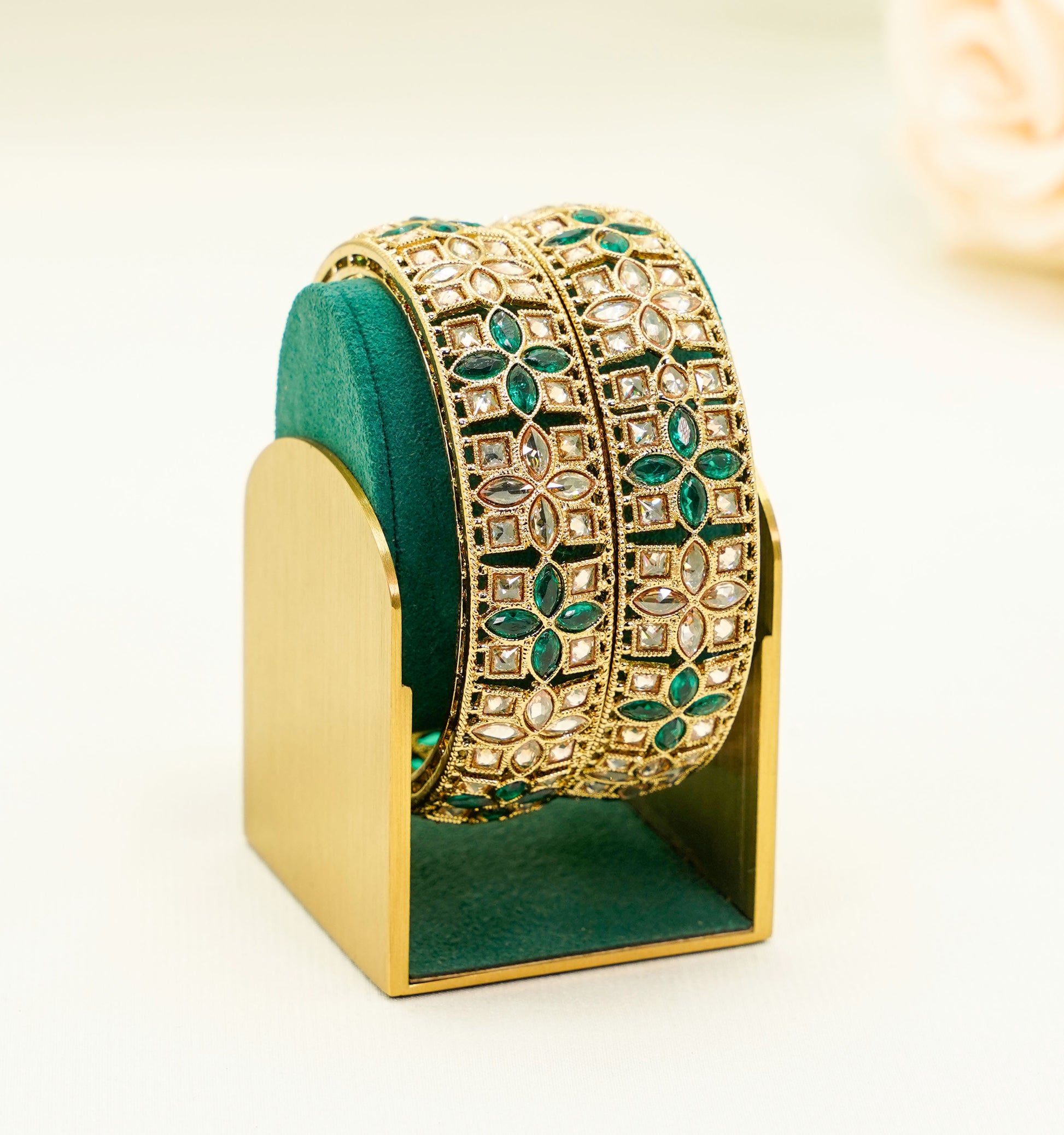 Make a bold statement with these gorgeous traditional Kundan bangles. Designed with a luxurious gold base, these bangles are studded with Green stones and shimmering white Kundan gems. The delicate arrangement of circular patterns adds a royal touch, perfect for pairing with ethnic wear during weddings, festive events, or special celebrations. Their timeless appeal and rich colours make them a must-have in your jewellery box.
