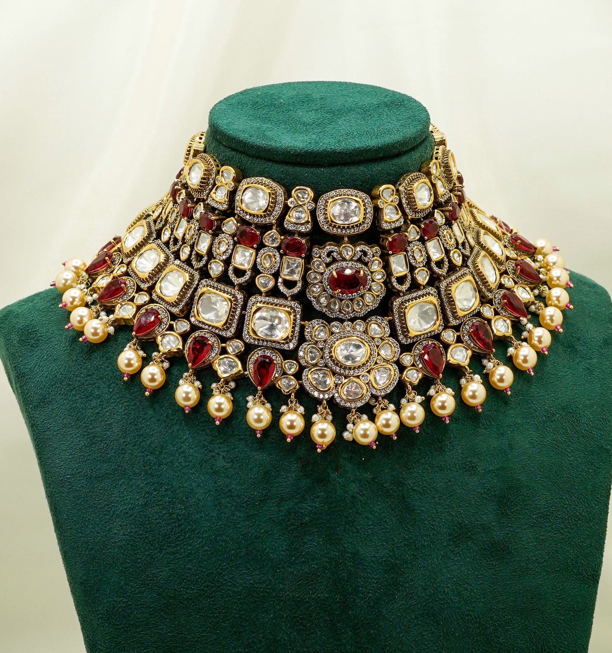 Elevate your traditional elegance with our stunning bridal jewellery set, featuring an intricate necklace, earrings, and maang tikka. Crafted with exquisite craftsmanship, this jewellery set combines sparkling crystals, lustrous pearls, and detailed gold work to create a regal look perfect for weddings, festivals, and special occasions.
