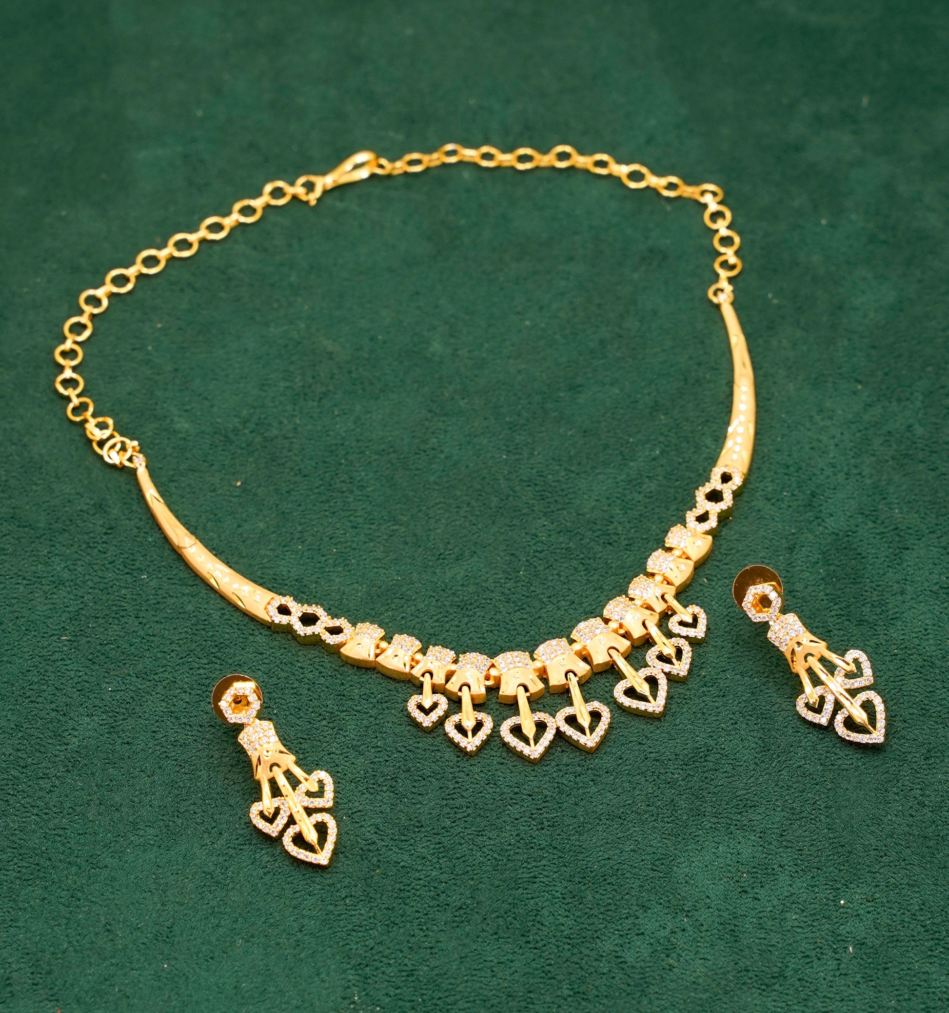 - This elegant gold-plated with clear stones necklace features an exquisite heart motif with intricate detailing.