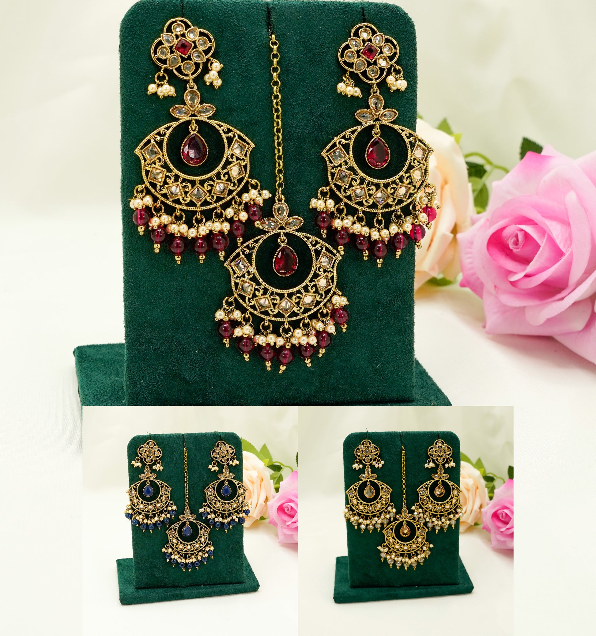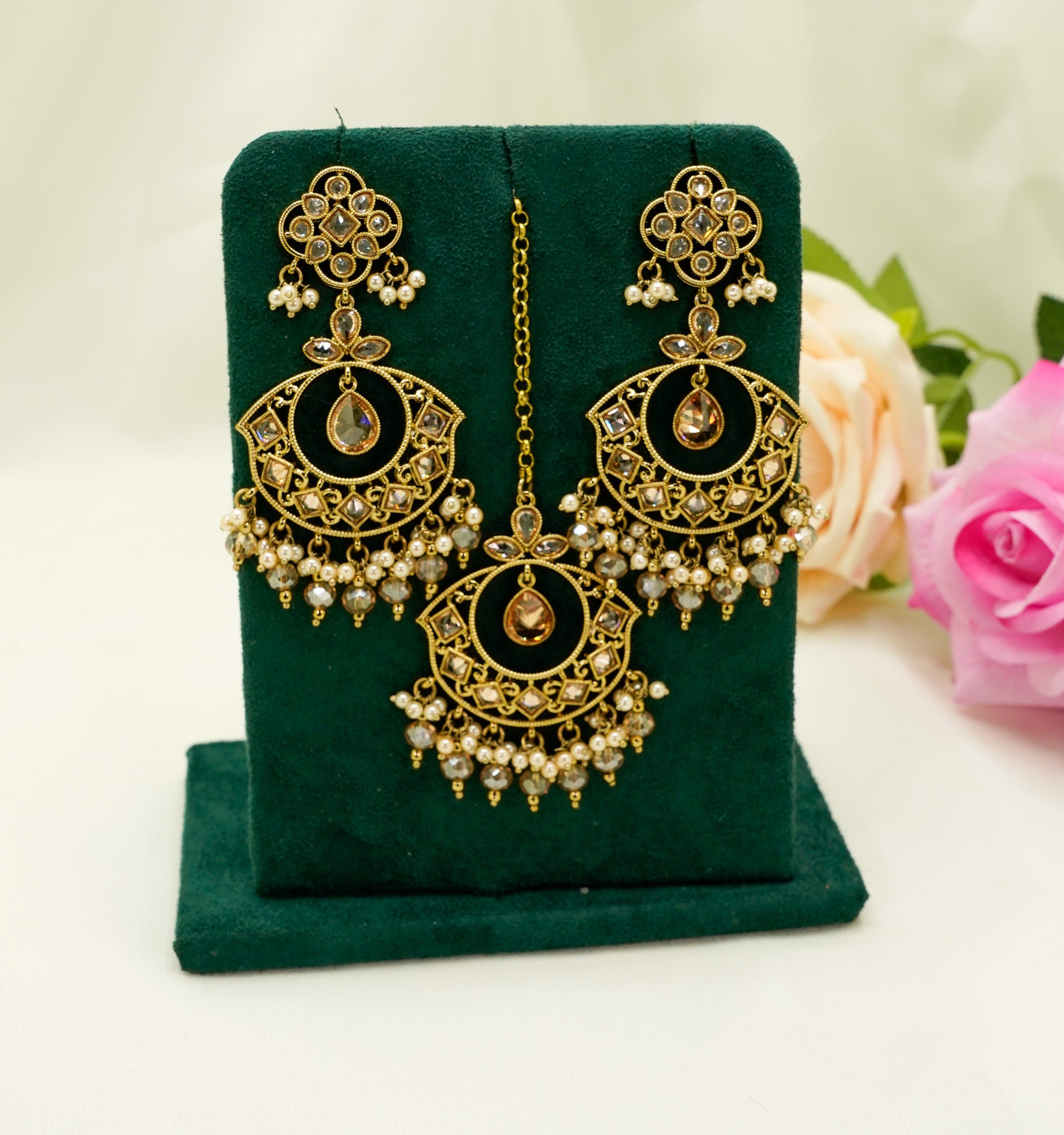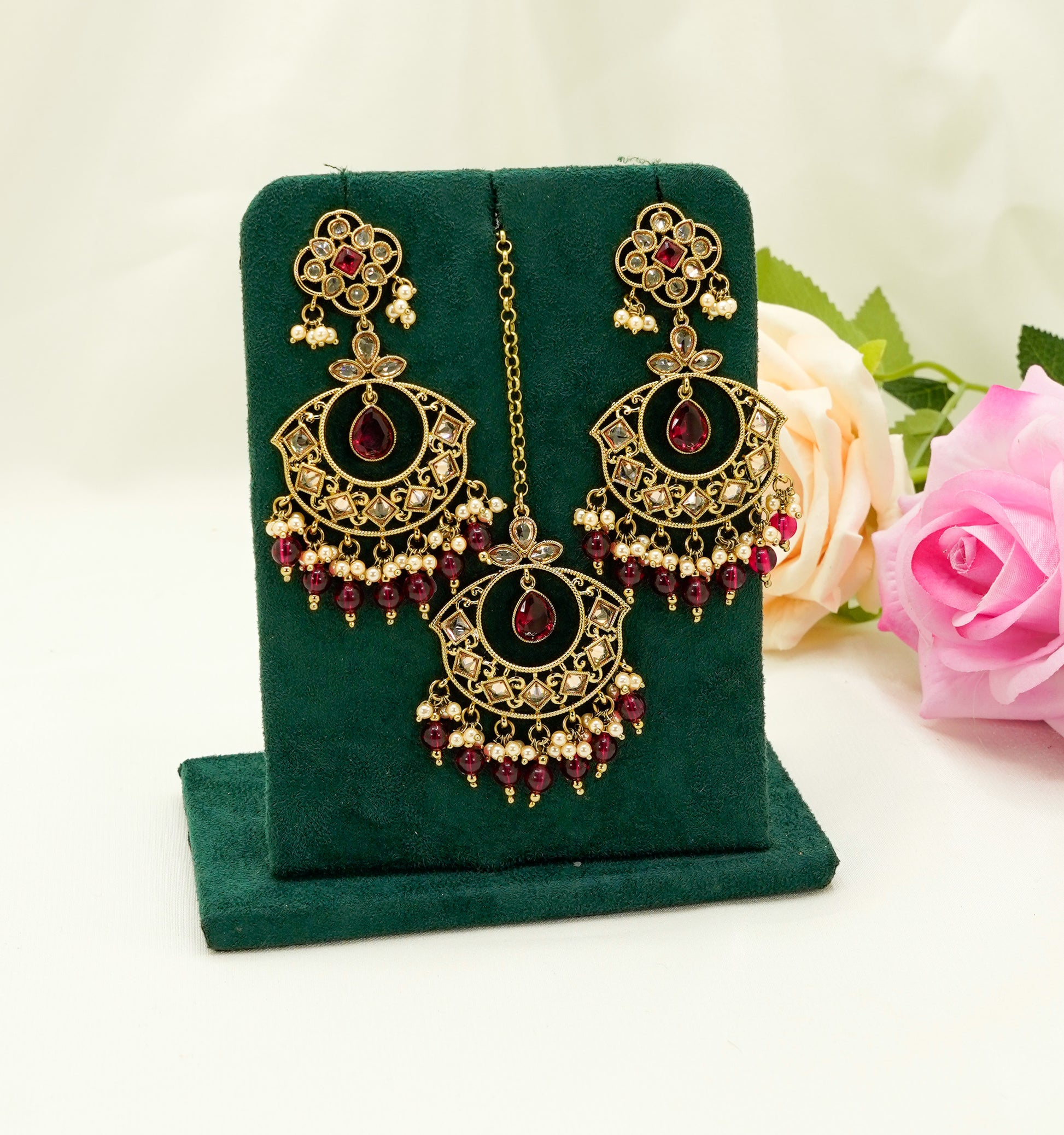 Set Includes: 1 Pair of Jhumka Earrings with Pearl Strings, 1 Coordinating Tikka