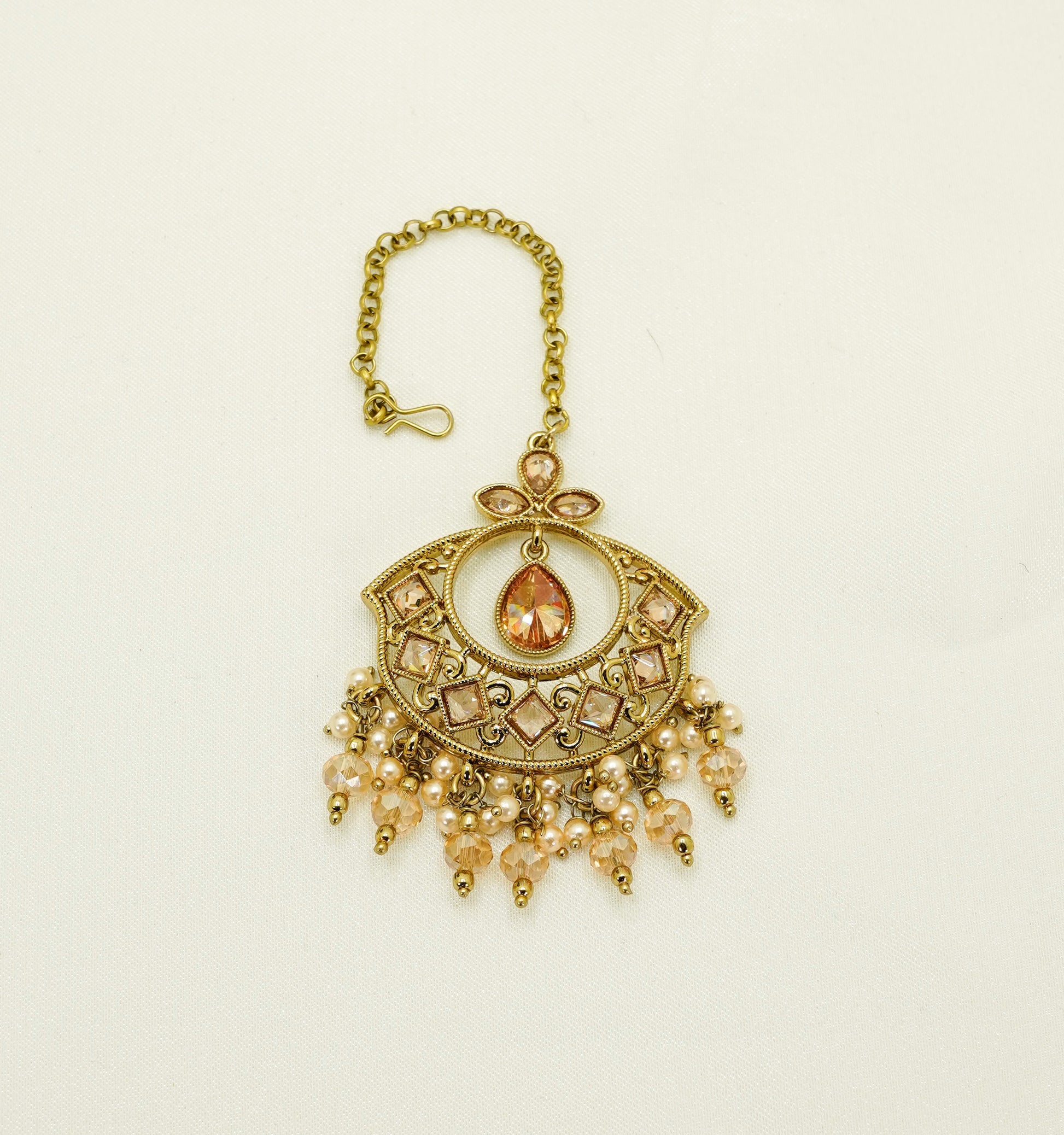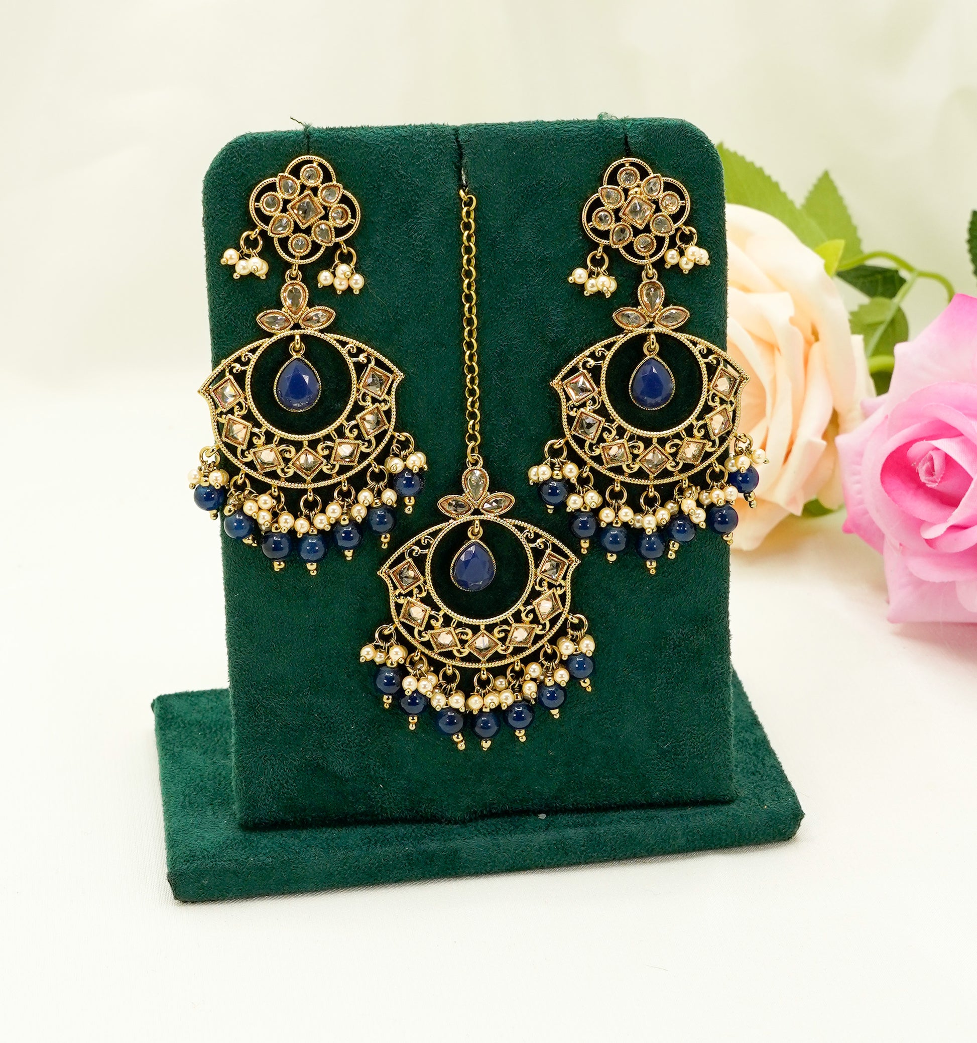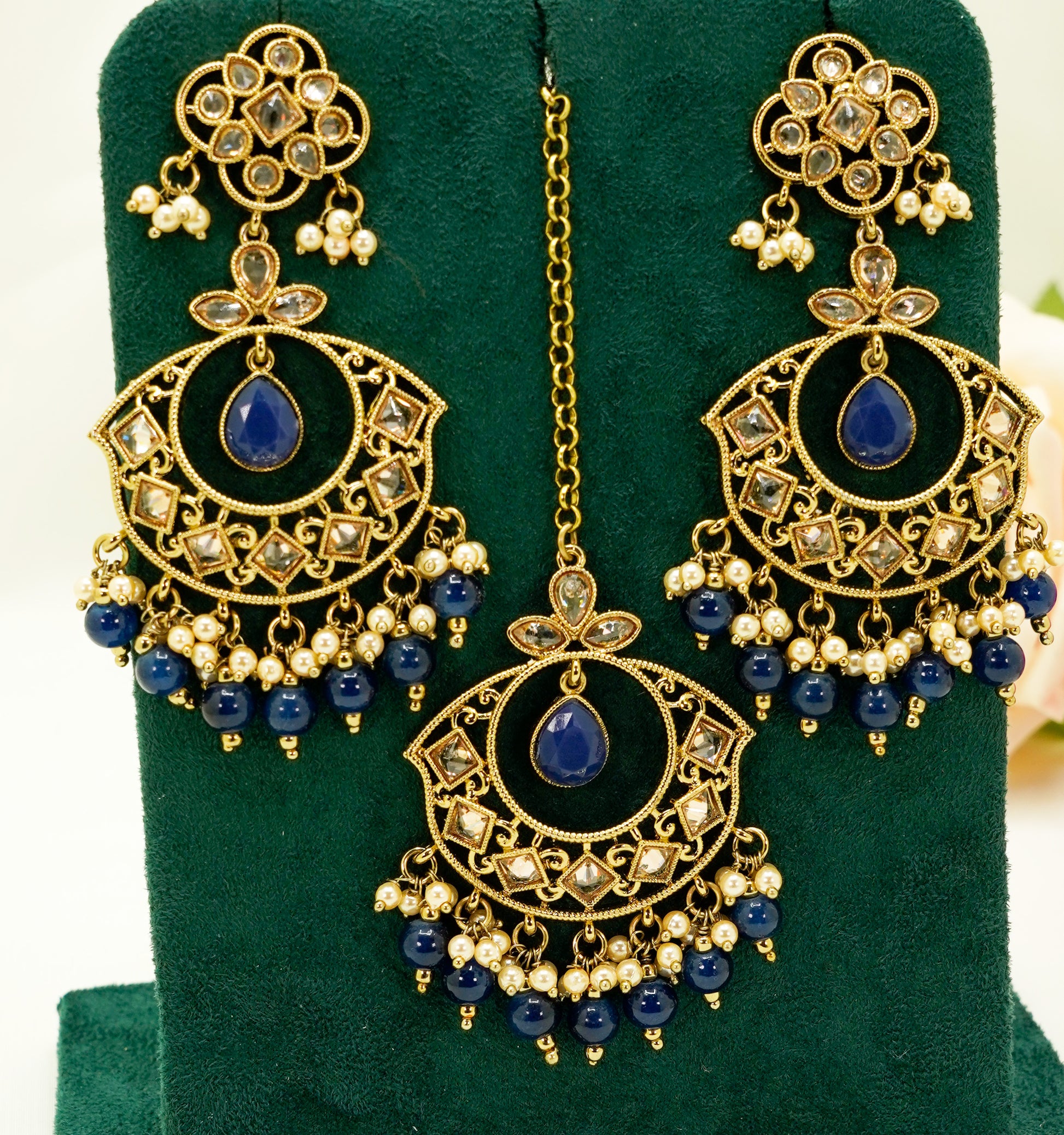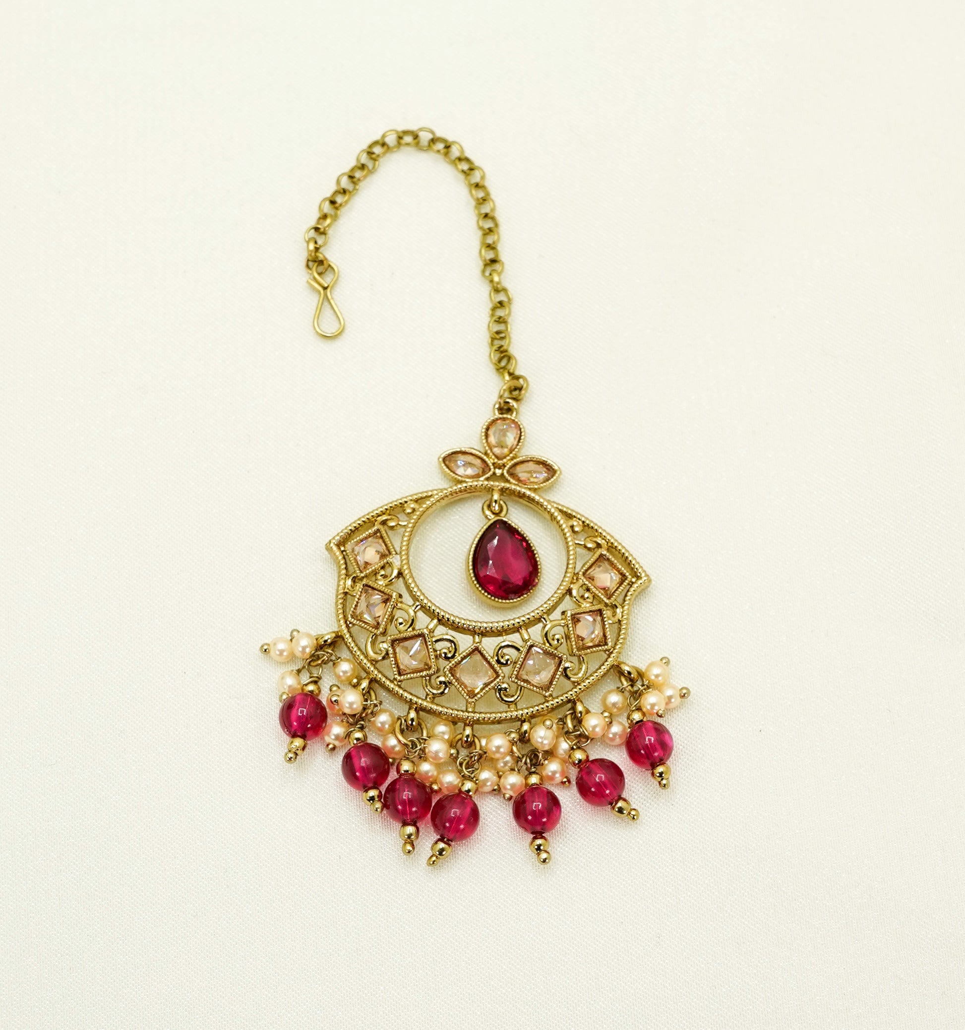 Set Includes: 1 Pair of Jhumka Earrings with Pearl Strings, 1 Coordinating Tikka