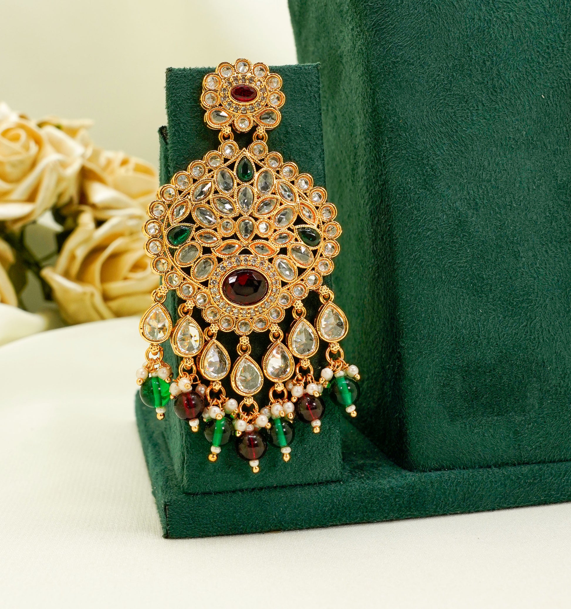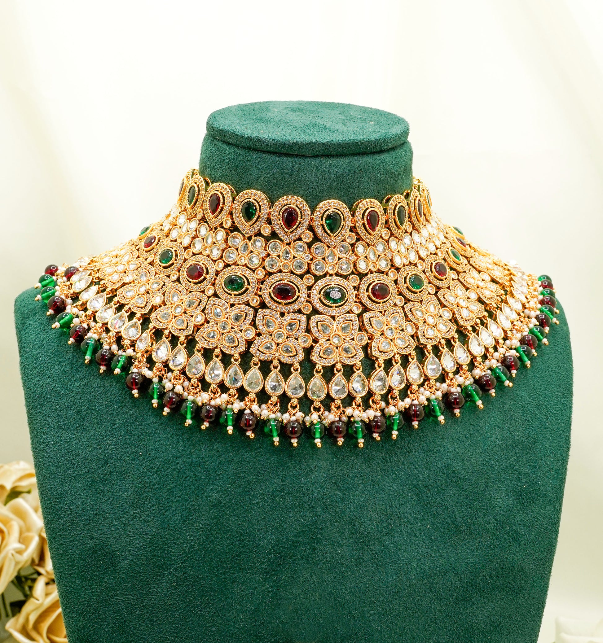 Choker Necklace: Gold-plated with sparkling white stones and vibrant red, green, and maroon accents. Detailed with floral motifs and tear-drop dangles.