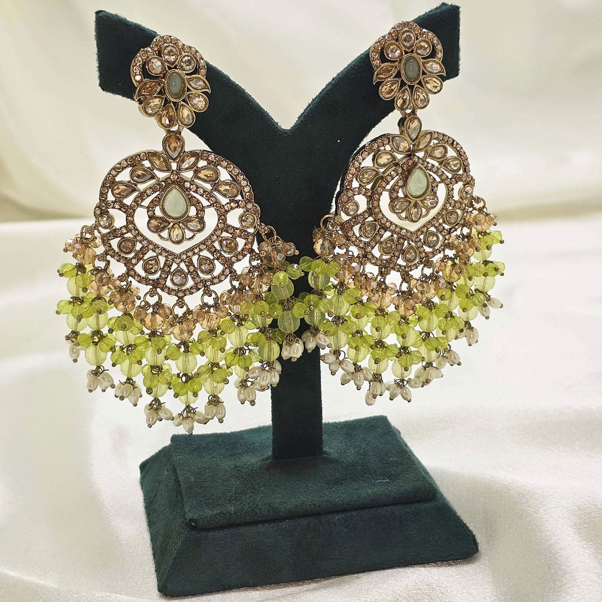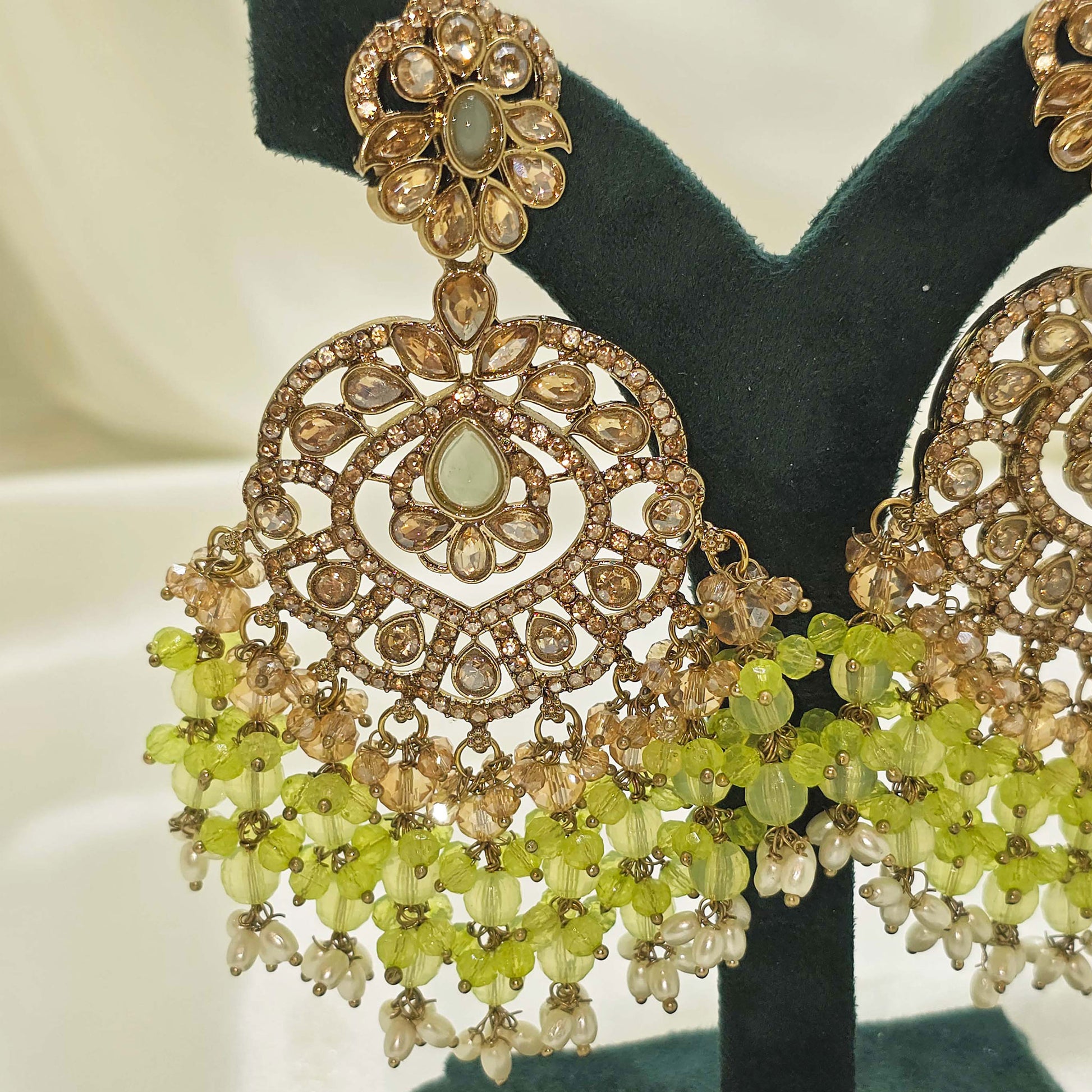 Step into your Nikah or Walima with confidence and grace wearing these olive green dangler jhumka earrings, designed for modest Muslim brides who value tradition and elegance. With a delicate balance of colour, pearls, and antique gold, these earrings complement Islamic bridal fashion beautifully.
