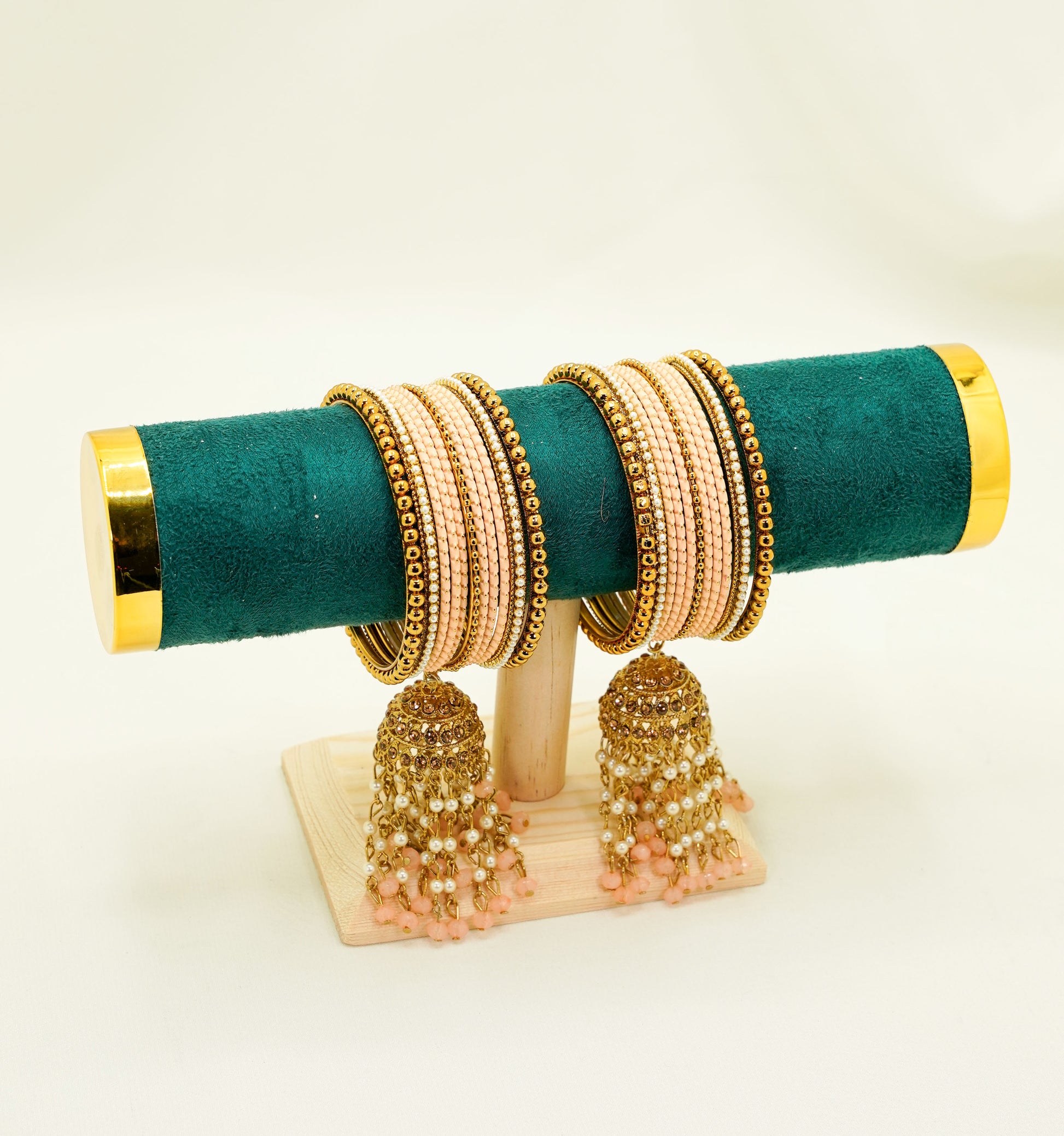 🎀 Delicate Jhumka Charms: Golden dome-shaped jhumkas adorned with pearls and peach crystal beads for an elegant touch.