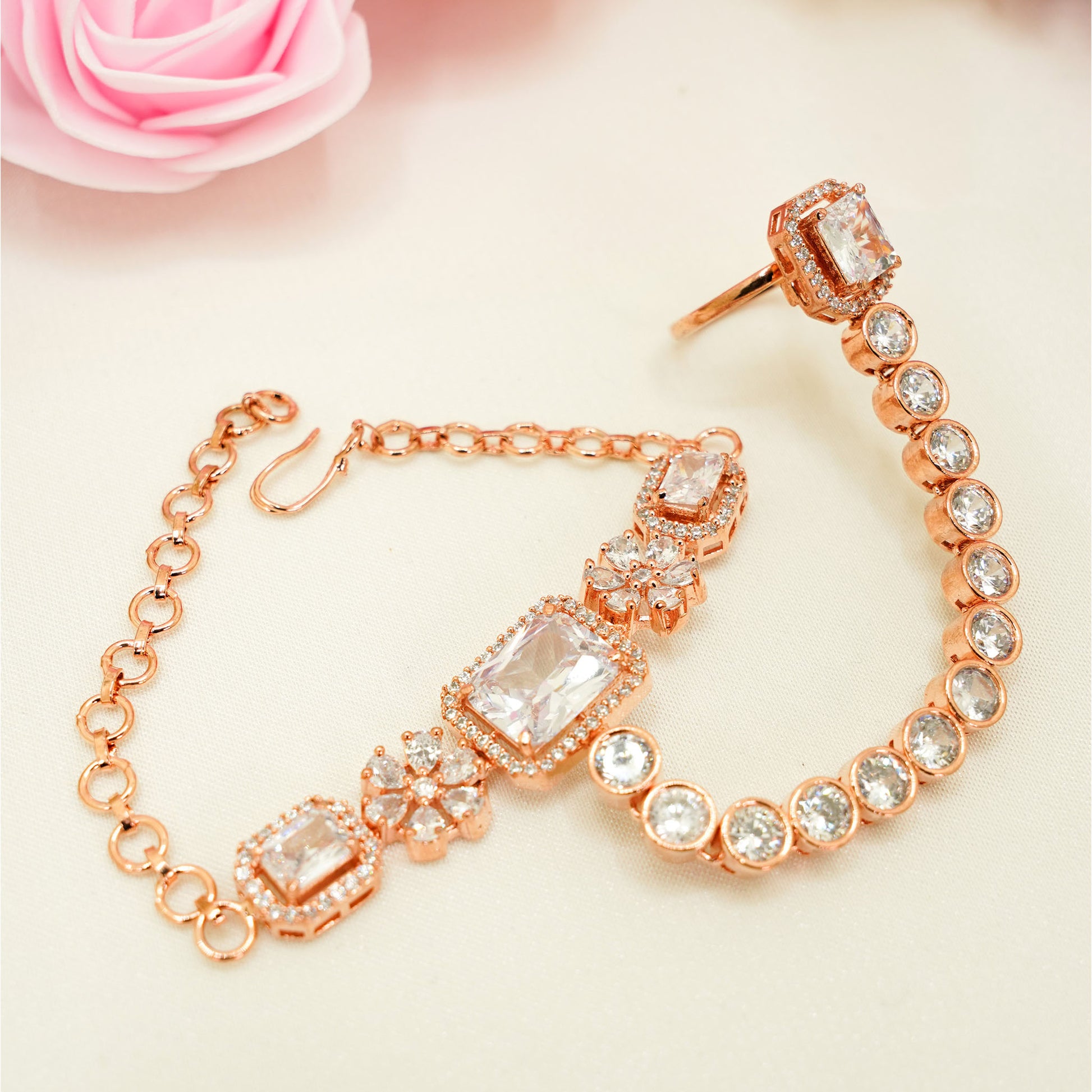 Elevate your festive and bridal looks with this stunning rose gold bracelet and ring set – a sparkling statement piece crafted for elegance. Featuring large crystal-cut stones and a coordinating ring with a sleek link bracelet design, this piece adds a luxurious finish to your hand without being overbearing.