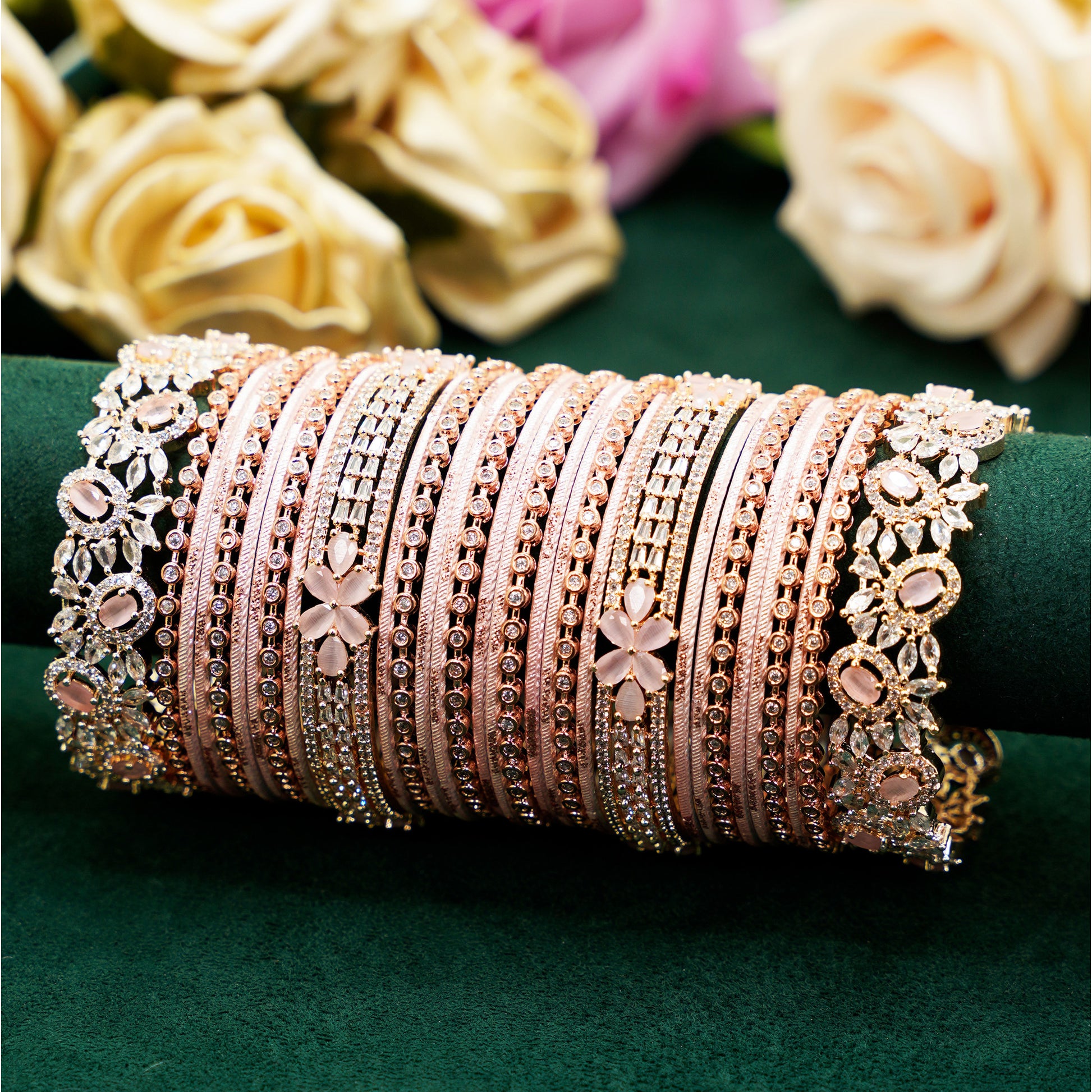 Delicate, dreamy, and utterly regal—this Rose Gold Bridal Bangle Set is the ultimate statement piece for your special occasion. Featuring a stunning blend of rose-gold metal, soft blush pink floral accents, and sparkling crystals, this 22-piece set exudes femininity and elegance from every angle.