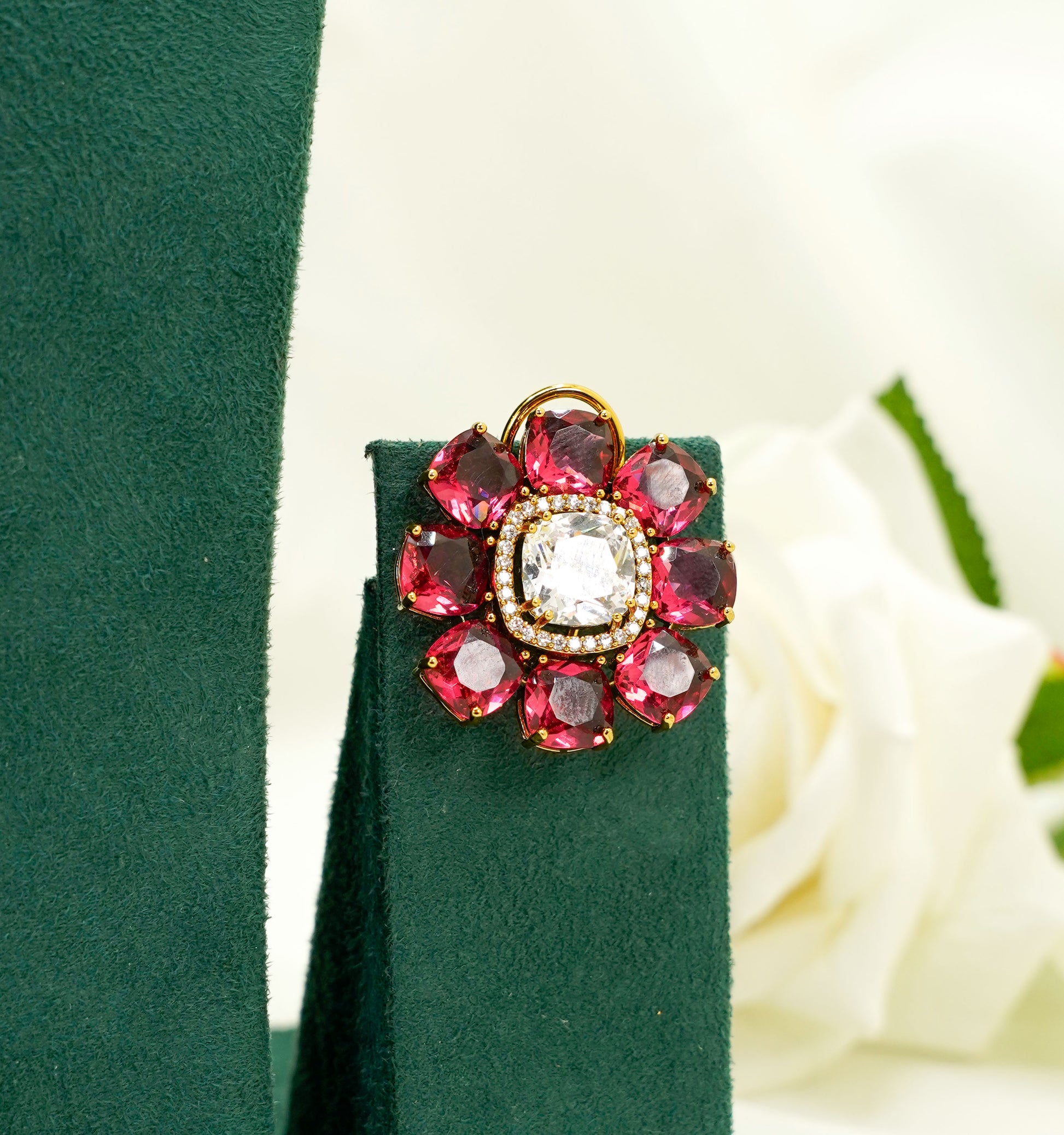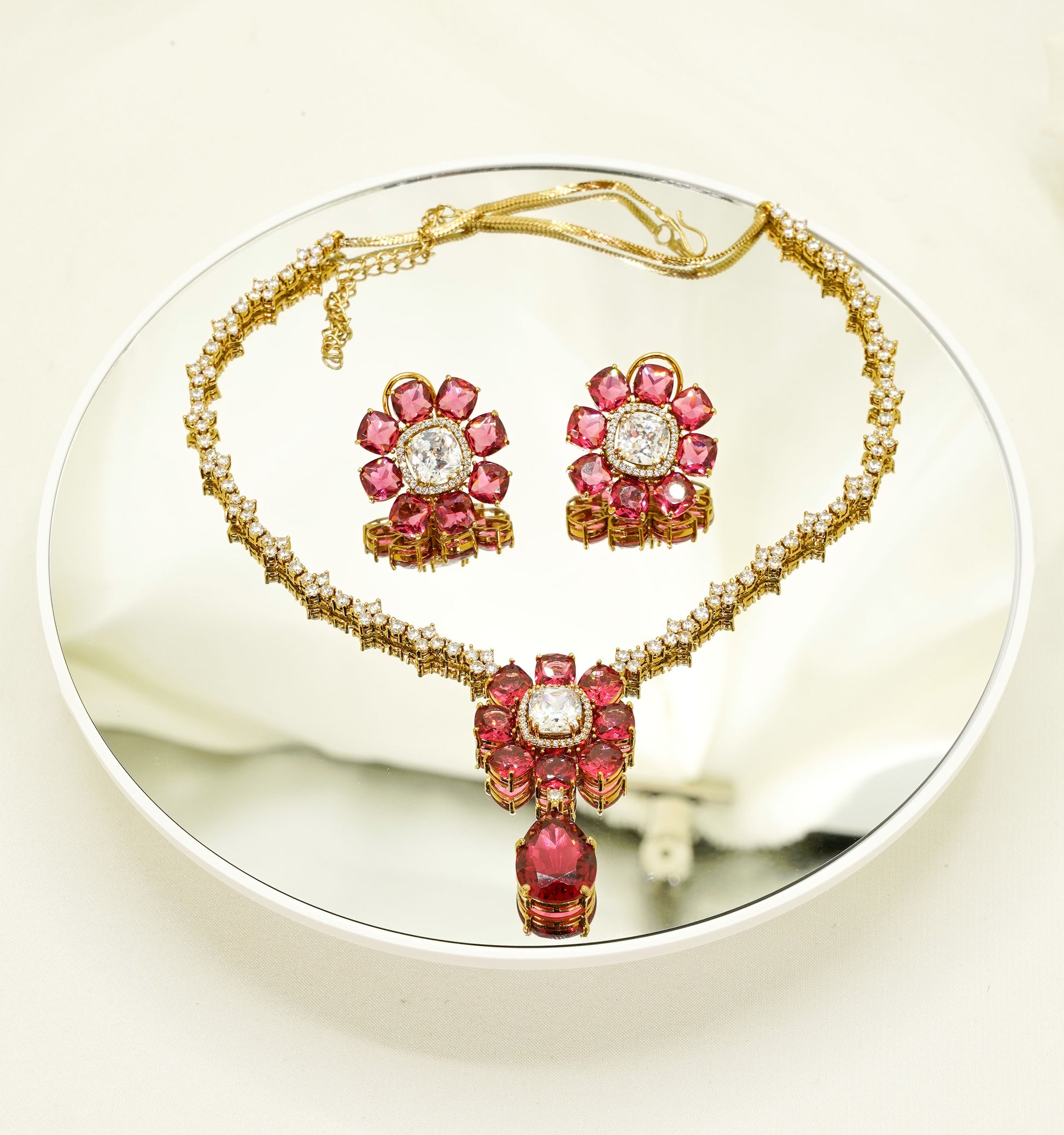 This elegant jewellery set includes a necklace and matching earrings. It has a pretty flower design with shiny red stones and sparkling white stones in the centre. The necklace has a gold-coloured chain with small crystals and a big pendant that looks perfect for special occasions.