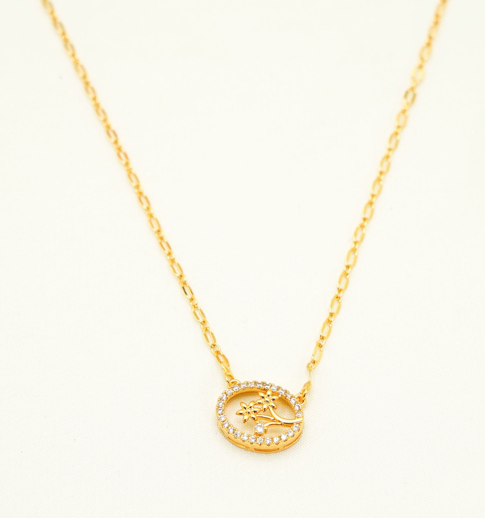 Bring a touch of nature’s elegance to your jewellery collection with this Gold-Plated Floral Circle Pendant Necklace. The uniquely shaped pendant features graceful floral artwork within a sparkling zircon-studded frame.