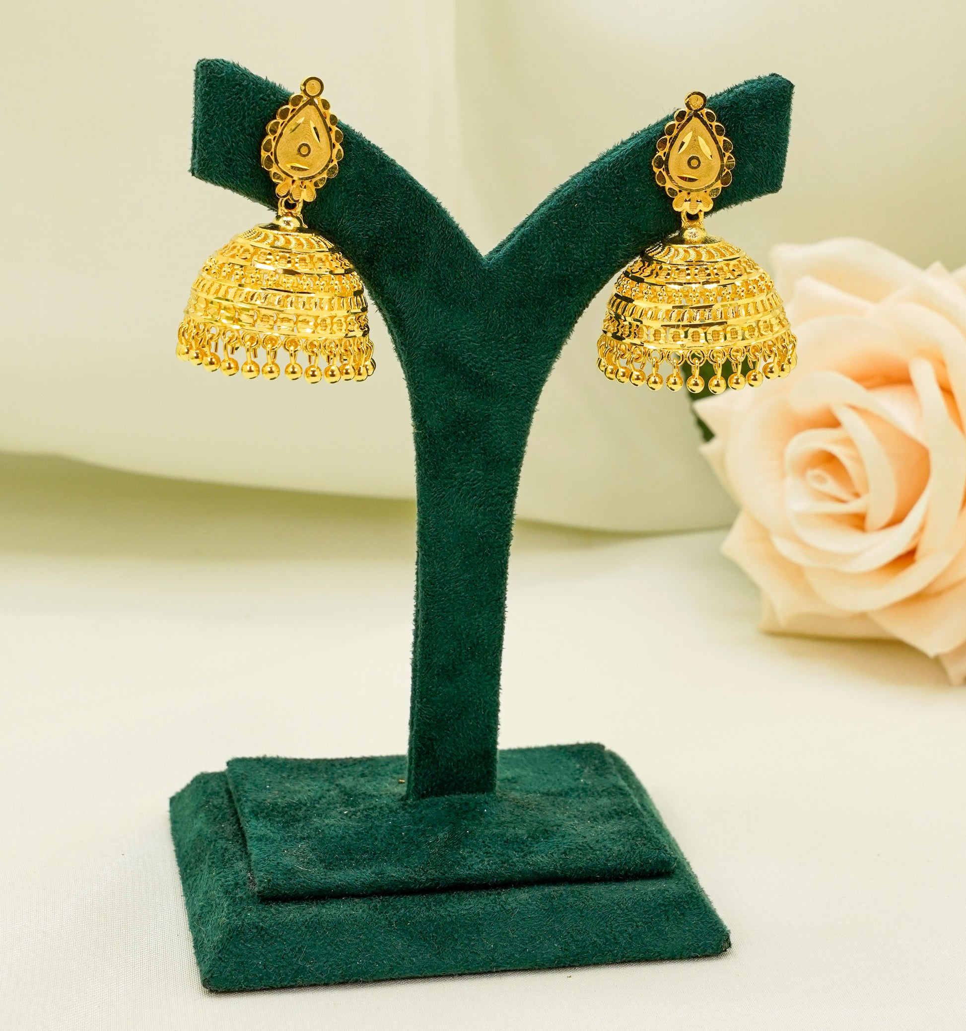 Design: Traditional dome-shaped jhumka with detailed patterns