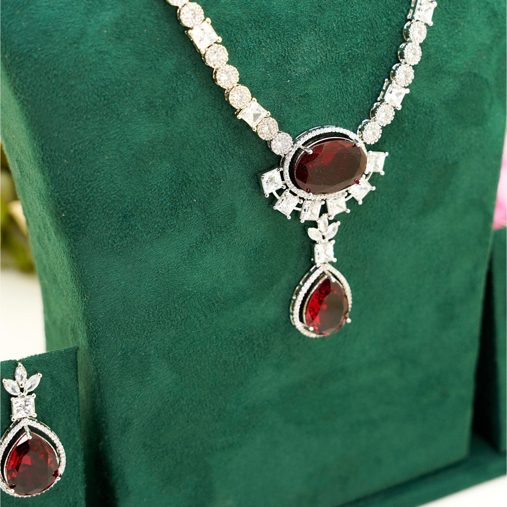 Elevate your formal wardrobe with this dazzling Silver Zircon Necklace Set, a perfect blend of modern sparkle and traditional grace. Featuring a cascade of brilliant zircon stones and a statement maroon centrepiece, this set is designed to turn heads. The teardrop earrings complement the necklace for a complete look of timeless elegance.