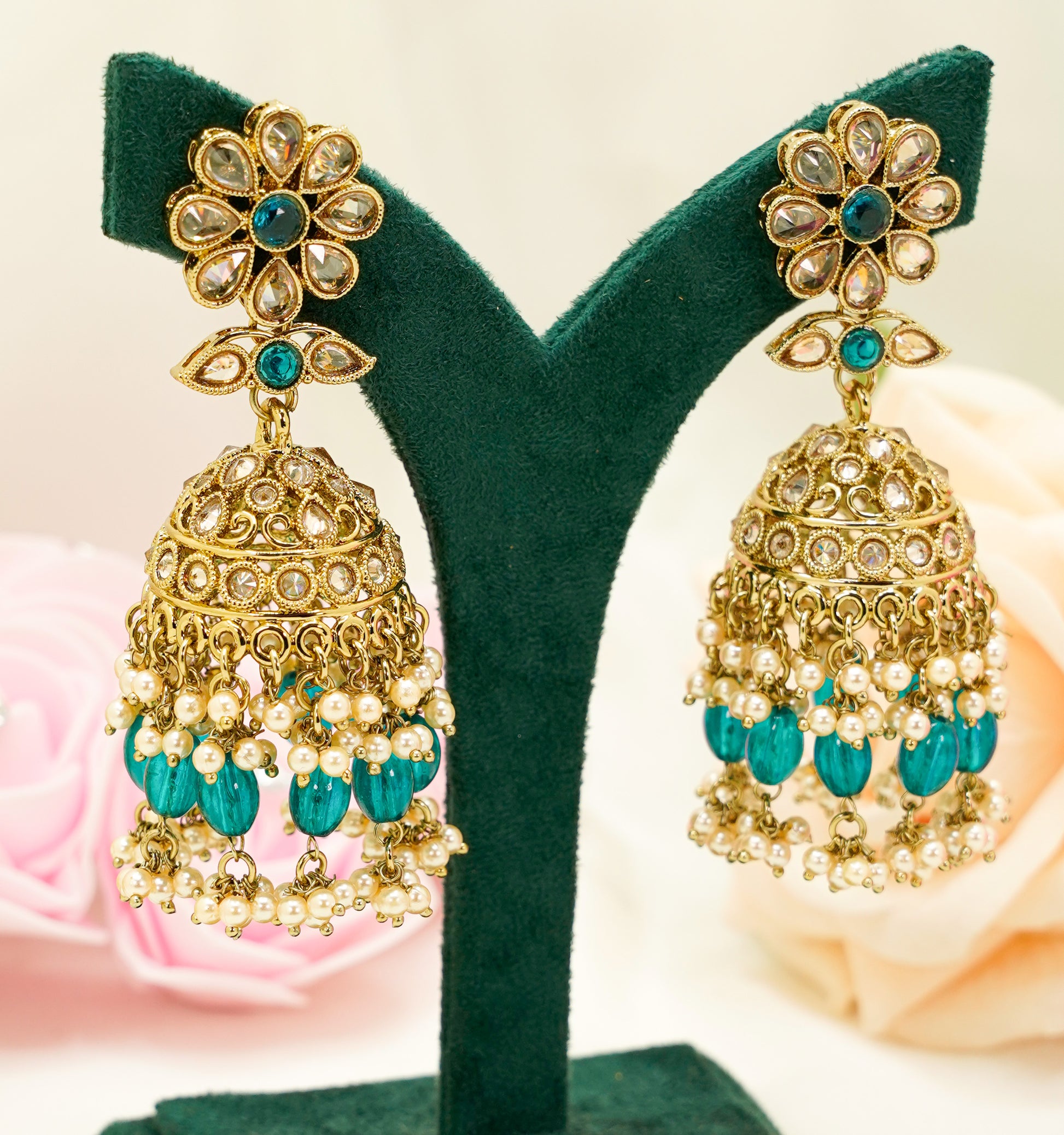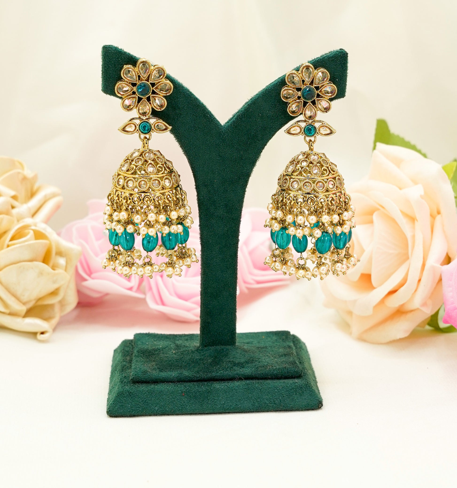 Elegant Jhumka Design: Traditional jhumka style with a modern twist. Vibrant teal gemstones add a pop of color. High-quality crystals for dazzling shine.