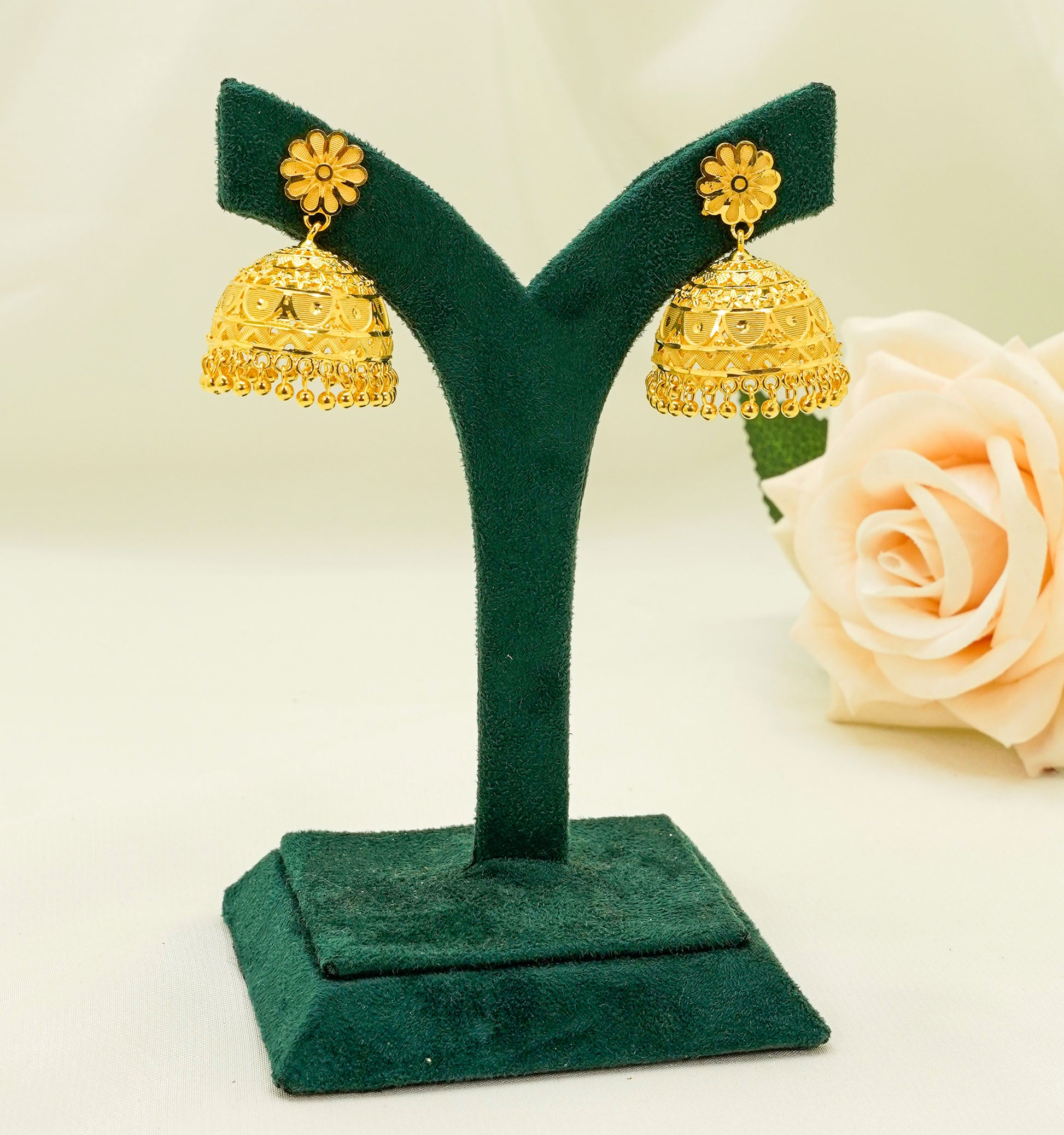These beautiful gold-plated jhumka earrings are perfect for traditional outfits and festive occasions. The earrings feature a pretty floral stud at the top and a classic bell-shaped jhumka with elegant carved designs.