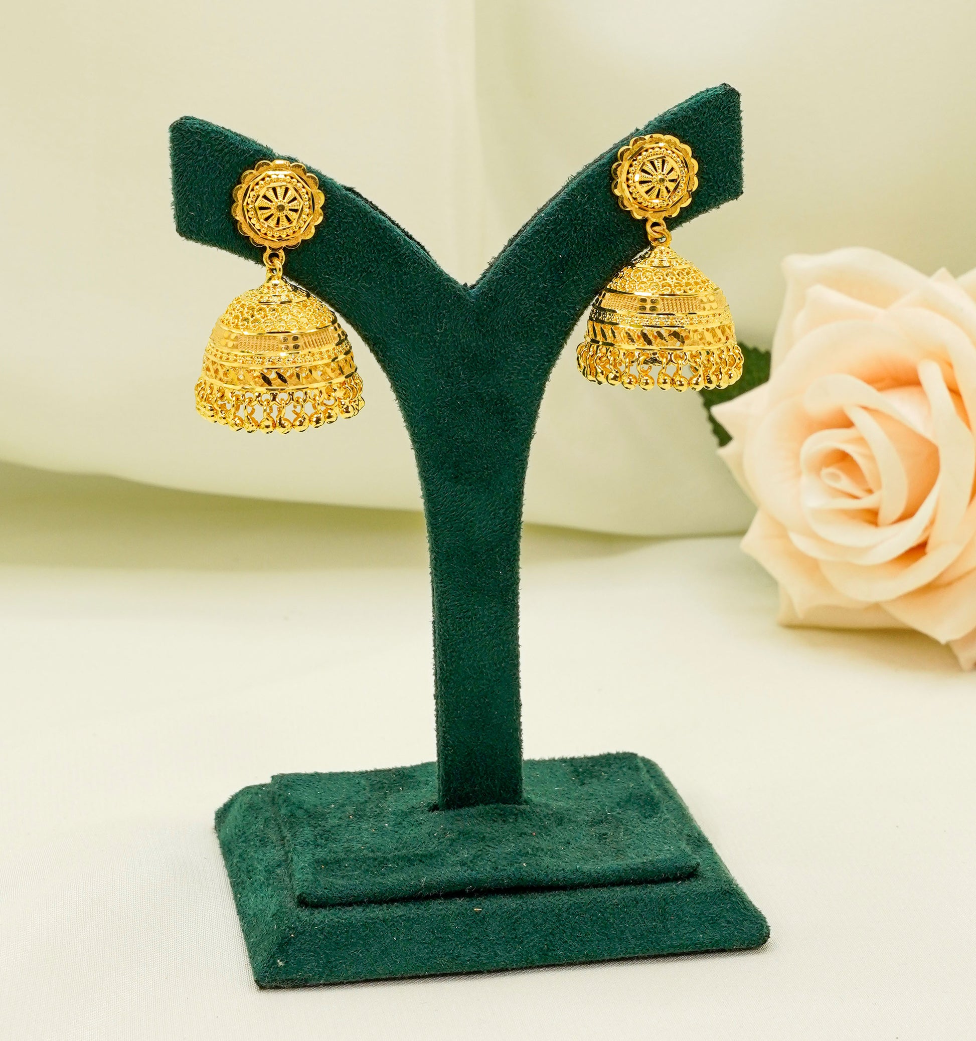 Design: Traditional dome-shaped jhumka with detailed patterns